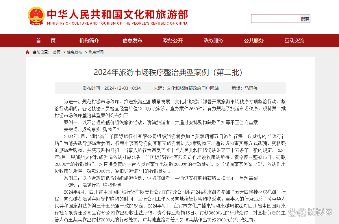 12月3日,文化和旅游部发布2024年第二批旅游市场秩序整治典型案例。