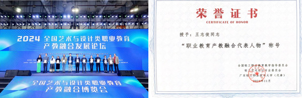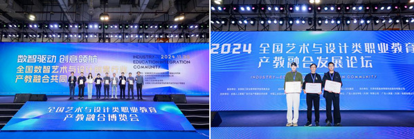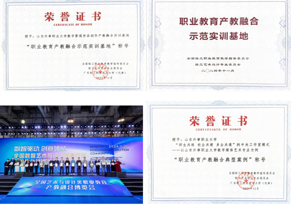 11月30日上午,职博会的重头戏——荣誉颁发仪式如期举行。经全国轻工行指委艺术设计专业教学指导委员会、行指委专家评选,山东外事职业大学成为“职业教育产教融合实训基地”;艺术学院数字影视作品创作产教融合基地获“职业教育产教融合示范实训基地”称号,其实训基地建设经验将面向全国推广;“师生共练、校企共建、多企融通”的中央工作室模式(以山东外事职业大学数字媒体艺术专业为例)荣获“职业教育产教融合典型案例”称号,其案例经验将在全国艺术设计类专业中广泛传播。此外,艺术学院院长王志俊教授被授予“职业教育产教融合代表人物”称号,数字媒体艺术专业教研室主任陈超、王唯宇博士被聘为全国轻工职业教育教学指导委员会轻工艺术设计专业委员会智库专家。学校艺术学院获批成为“全国数智艺术与设计创意行业产教融合共通体成员单位”。