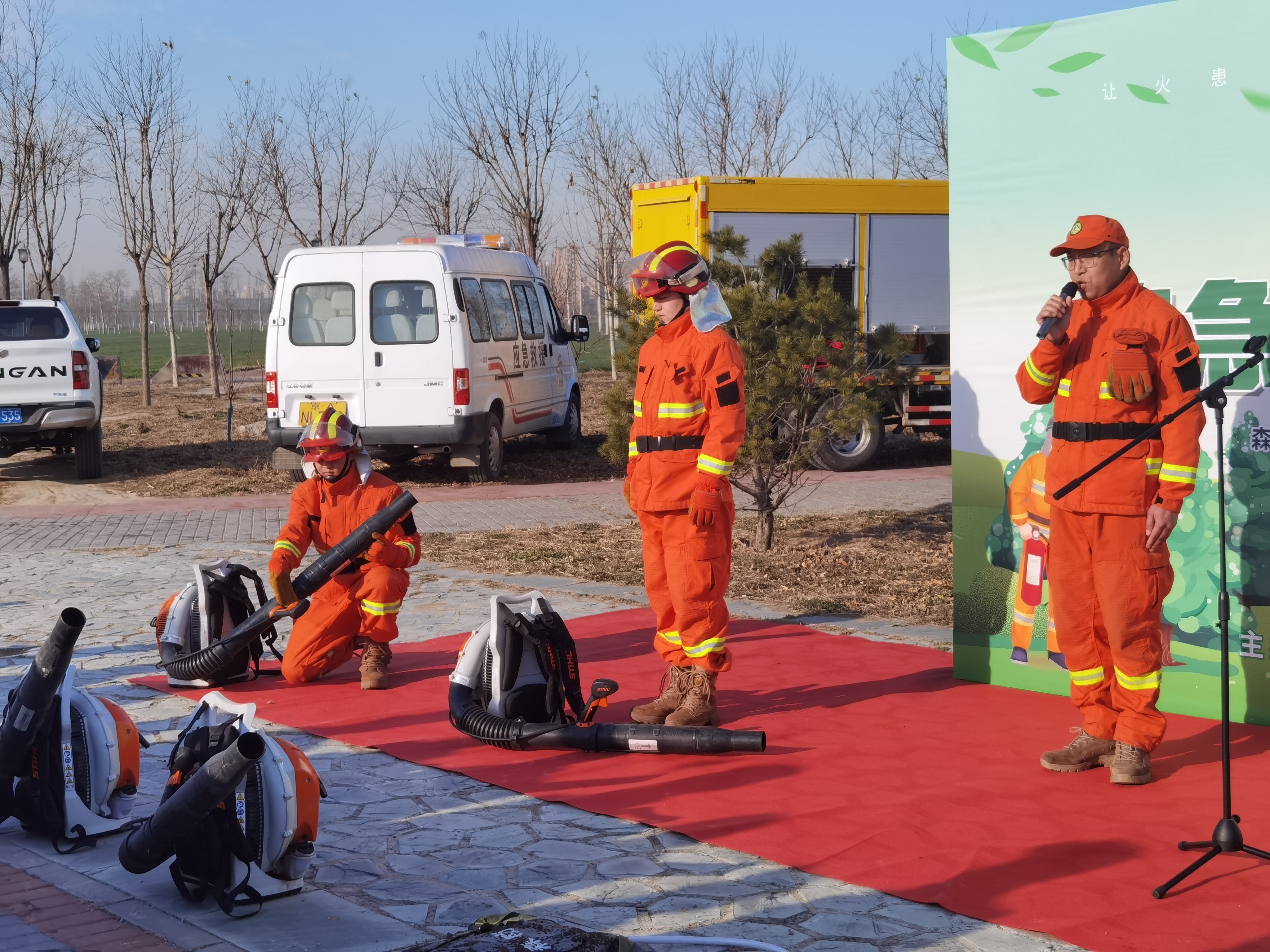 通过悬挂横幅、发放宣传资料等形式向周边居民宣传森林防火重要性与相关法律法规。宣传单页有醒目的防火标语,如 “关注森林防火,守护绿色家园”“森林防火,人人有责” 等,还详细介绍了扑灭森林火灾原理方法、发现森林火灾的自救方式,并配有消防员救援等生动图片,直观展现森林防火的重要性。