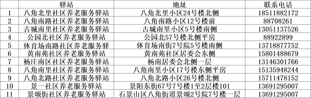 (八角街道11家养老驿站位置及联系方式)