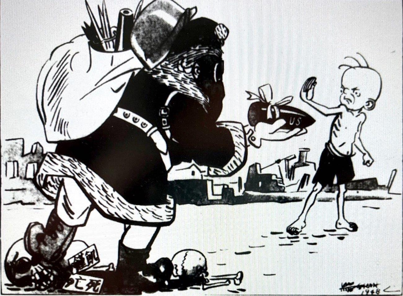 《吃不消的礼物》中,美帝国主义送来的“礼物”是屠杀中国人民的武器。作品在揭露和控诉黑暗社会的同时,也从侧面反映了当时人民群众的革命斗争。虽然对国统区的民主运动没有正面的描绘,但从某些画幅里仍然可以使读者感到革命斗争在进行着,它像洪流一样冲击着黑暗的社会。