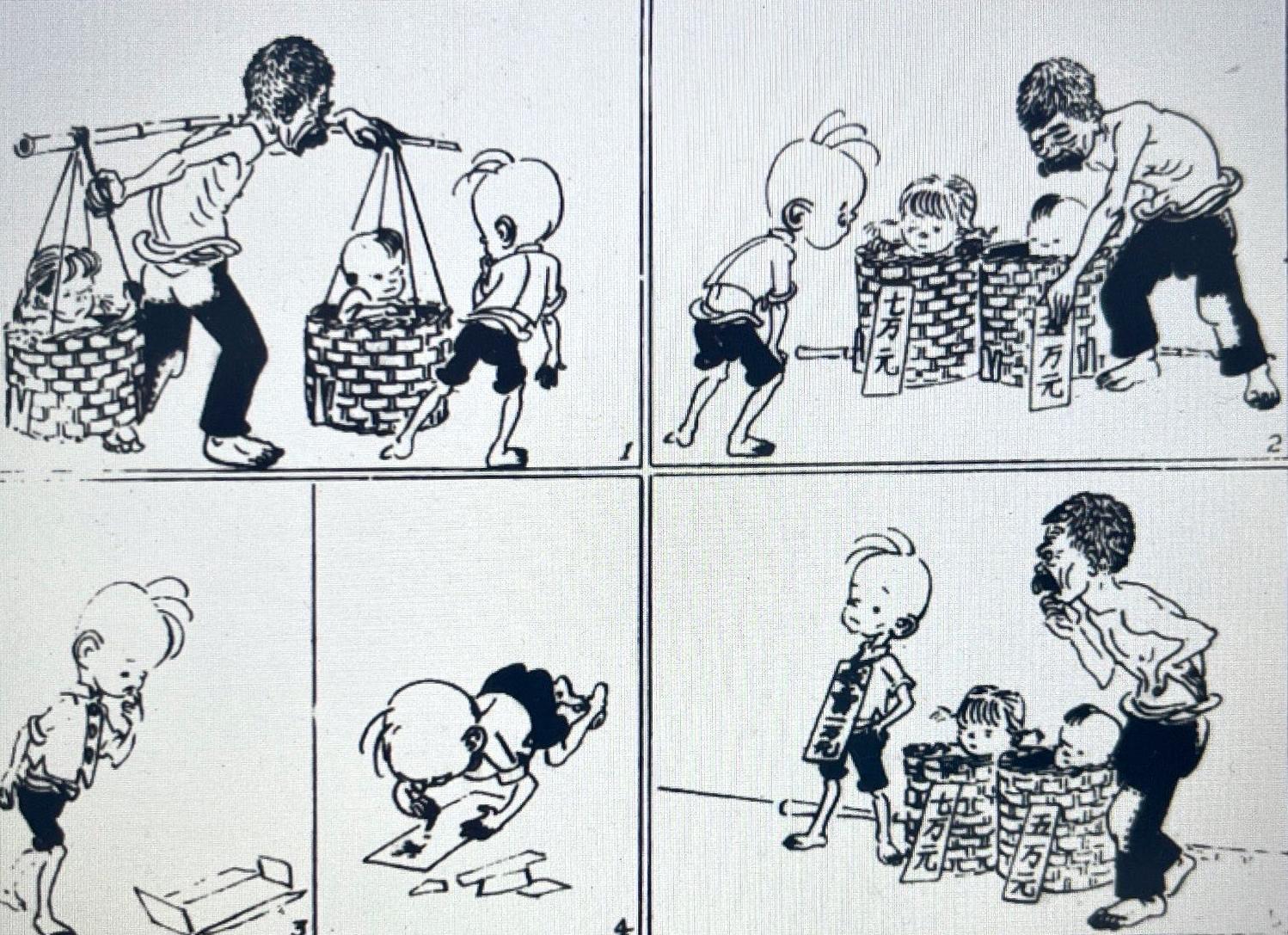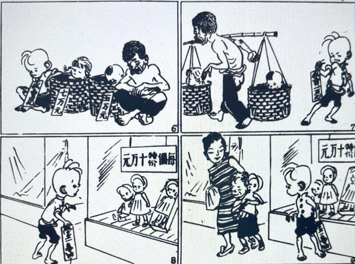 ▲漫画《万元身价》(1947)张乐平;《不如洋娃》(1947)张乐平;《吃不消的礼物》(1948年)张乐平。
