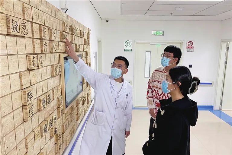 “我在候诊时看到这里有中医体验,就过来转转,没想到关于中医的知识这么全面,而且互动体验感特别好,尤其是智能针灸铜人把所有穴位都标注出来了,按到某个穴位时还有讲解,让我学到了很有用的养生知识。”刚刚体验完的曹女士说。