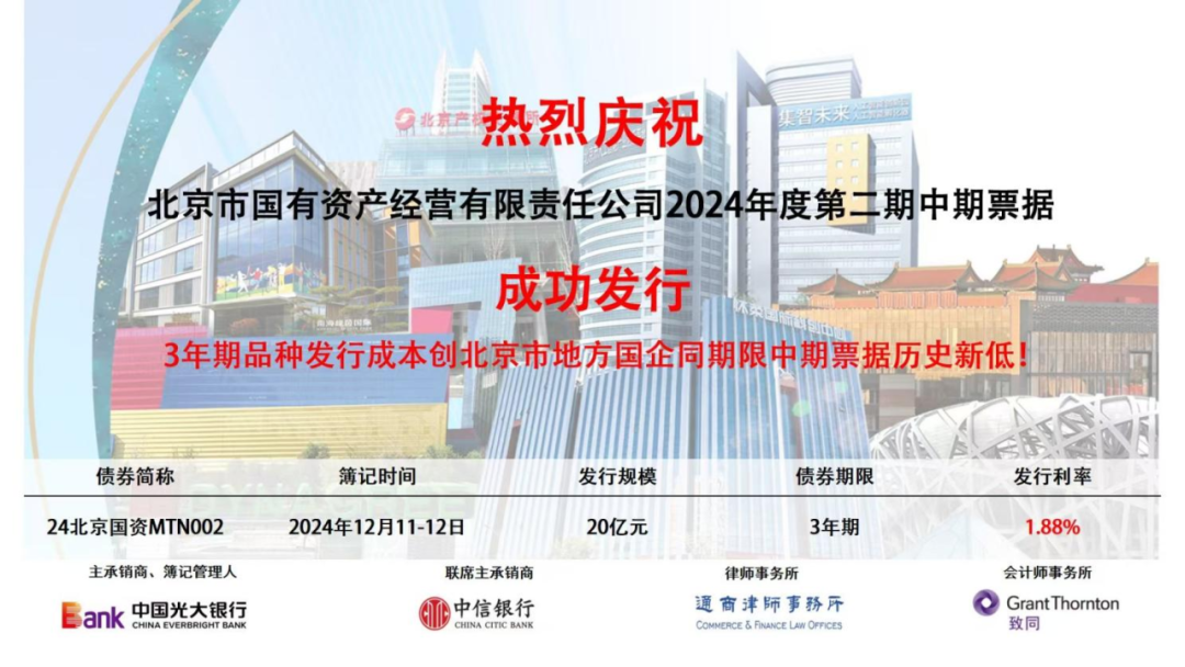 12月12日,北京国资公司在银行间市场交易商协会成功发行2024年度第二期中期票据,发行规模20亿元,期限3年,票面利率1.88%,发行成本创北京市地方国企同期限中期票据历史新低。