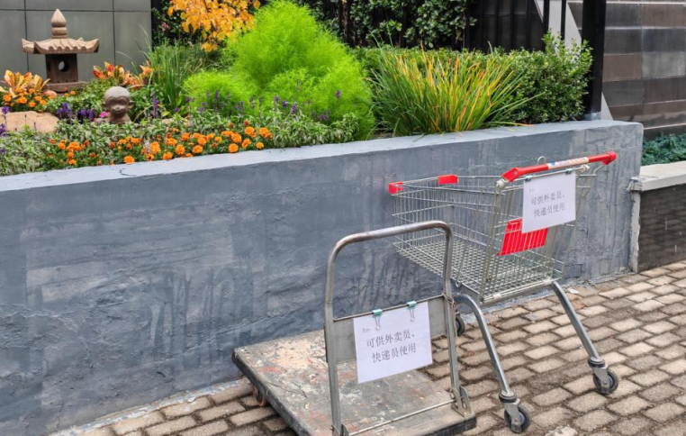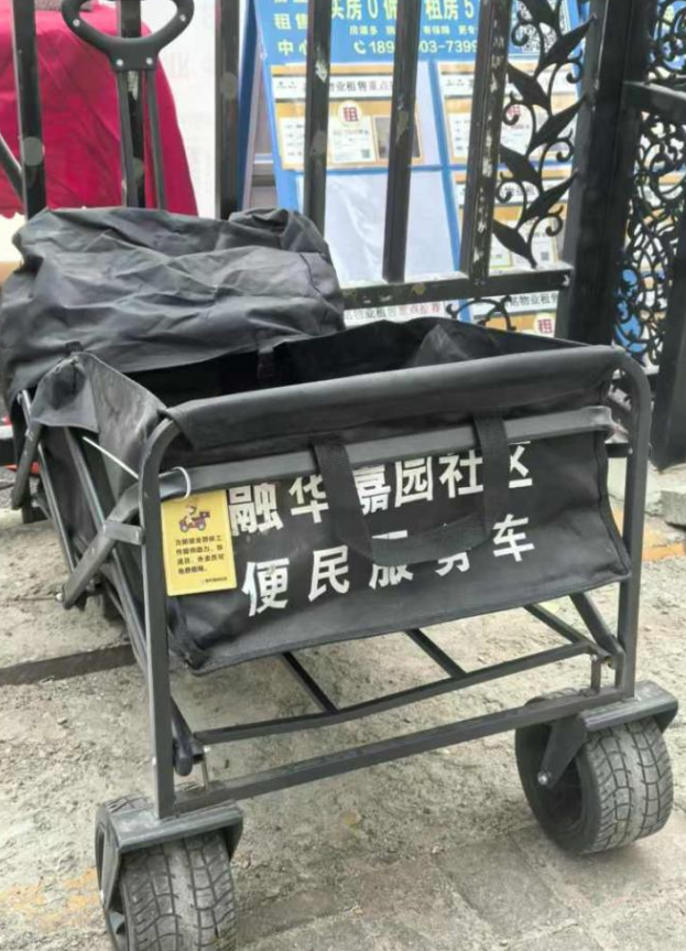 融华嘉园社区积极整合资源,在小区主要入口配备小推车、平板车等快递外卖配送专用摆渡车供骑手使用,为他们提供更加便捷的配送方案,让快件、餐品能够及时、安全地送到居民手中,畅通配送的“最后一公里”。