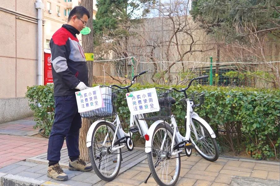 安慧东里第二社区干杨树小区横跨距离较长,老年群体及儿童占比较大。为保障居民出行安全,物业不允许骑手骑行进入,徒步配送大大降低了工作效率。为破解“进门难”问题,社区创新工作思路,积极协调物业购置10辆共享自行车,并进行定制化改造,分别放置在小区主要出入口供骑手使用,有效节约了配送时间,提高配送效率。