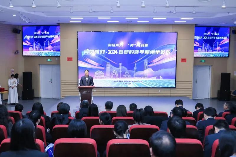 12月24日,“科技为光 ‘典’亮科普”——典赞时刻·2024首都科普年度榜单发布活动在北京科学中心举办,六大类60个年度榜单项目现场揭晓。北京市纲要实施办公室副主任、市科协党组成员、副主席孟凡兴出席活动并致辞。市纲要办成员单位、区科协等有关单位领导,以及获提名优秀项目的单位代表等180余人参加活动。