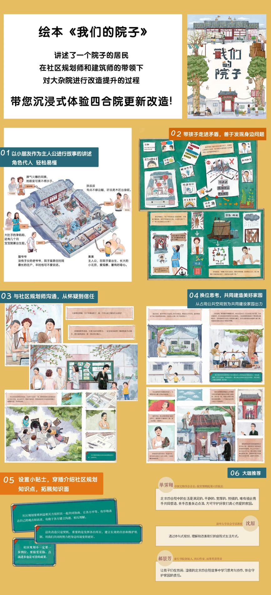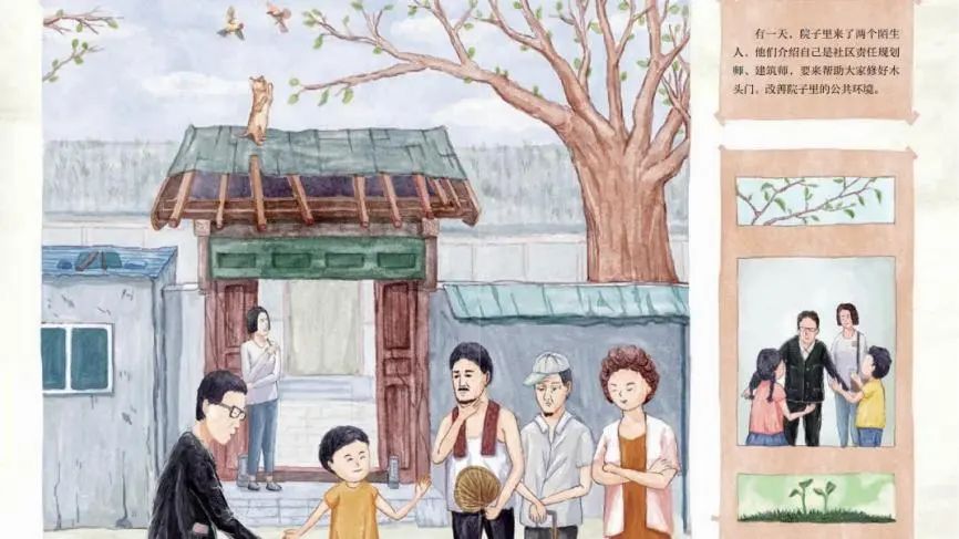 其中,本次的获奖作品《我们的院子》是一本围绕北京市责任规划师工作实践,以社区规划为主题的宣传科普产品。故事以东四南历史文化街区公共空间提升试点项目为蓝本进行绘本创作绘制,讲述了一个院子的居民在责任规划师的带领下对大杂院进行改造更新提升的过程。从儿童视角展现规划师开展参与式规划的理念,让他们在阅读中了解社区规划,向他们传递居民、政府、社会多方协作共同改善身边环境的理念与方法。