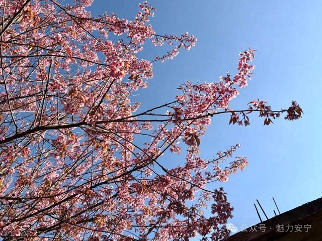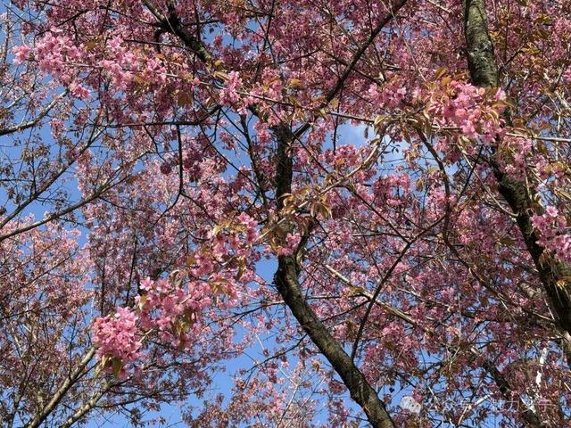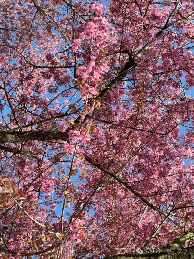 冬日暖阳里,蓝天白云下,一朵朵、一簇簇的樱花繁密热闹,开得热烈。一树树樱花迎风招展,嫩粉色的花瓣薄如蝉翼,在阳光下肆意散发美丽,惹得游人纷纷驻足欣赏拍照。从空中俯瞰,盛放的冬樱花仿若粉色的飘带,给南湖公园更添几分美丽。