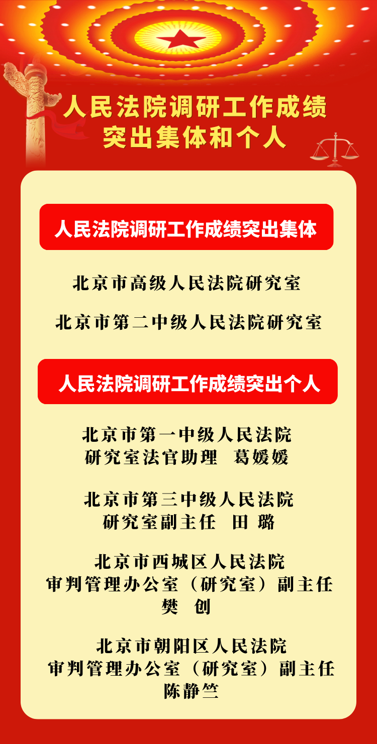 其中,北京市高级人民法院研究室、北京市第二中级人民法院研究室获人民法院调研工作成绩突出集体,北京市第一中级人民法院研究室法官助理葛媛媛(女)、北京市第三中级人民法院研究室副主任田璐(女)、北京市西城区人民法院审判管理办公室(研究室)副主任樊创、北京市朝阳区人民法院审判管理办公室(研究室)副主任陈静竺(女)获人民法院调研工作成绩突出个人。