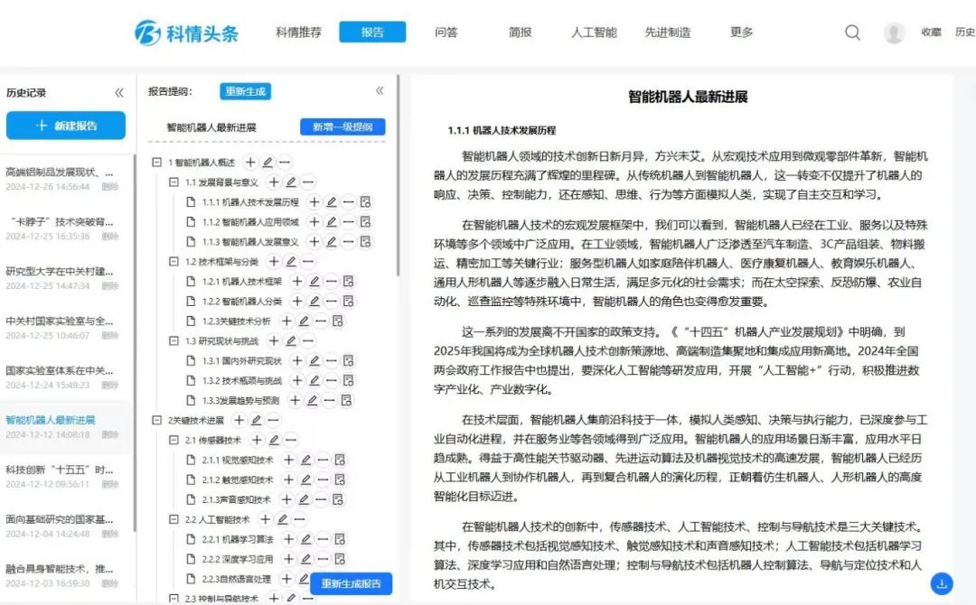 人工智能所贾倪博士团队与院科技情报研究所合作,依托创新工程项目,研发完成基于知识库的科技情报大模型撰写服务平台,利用大模型技术提升科技情报处理能力。在模型建设方面,成功构建了支持不小于100K上下文长度的科技情报垂直大模型,建立了超过10万条数据的本地矢量数据库;提供了基于知识库的科技情报问答、专报撰写、提纲生成、简报生成能力,研发了科技情报多任务融合学习方法,学习情报问答、专报撰写等多任务之间的共性知识,进一步提升了模型效果。在系统集成方面,项目成果已集成到“科情头条”平台,提供了包括情报智能问答、智能简报、报告辅助撰写等功能的科技情报智能化服务。