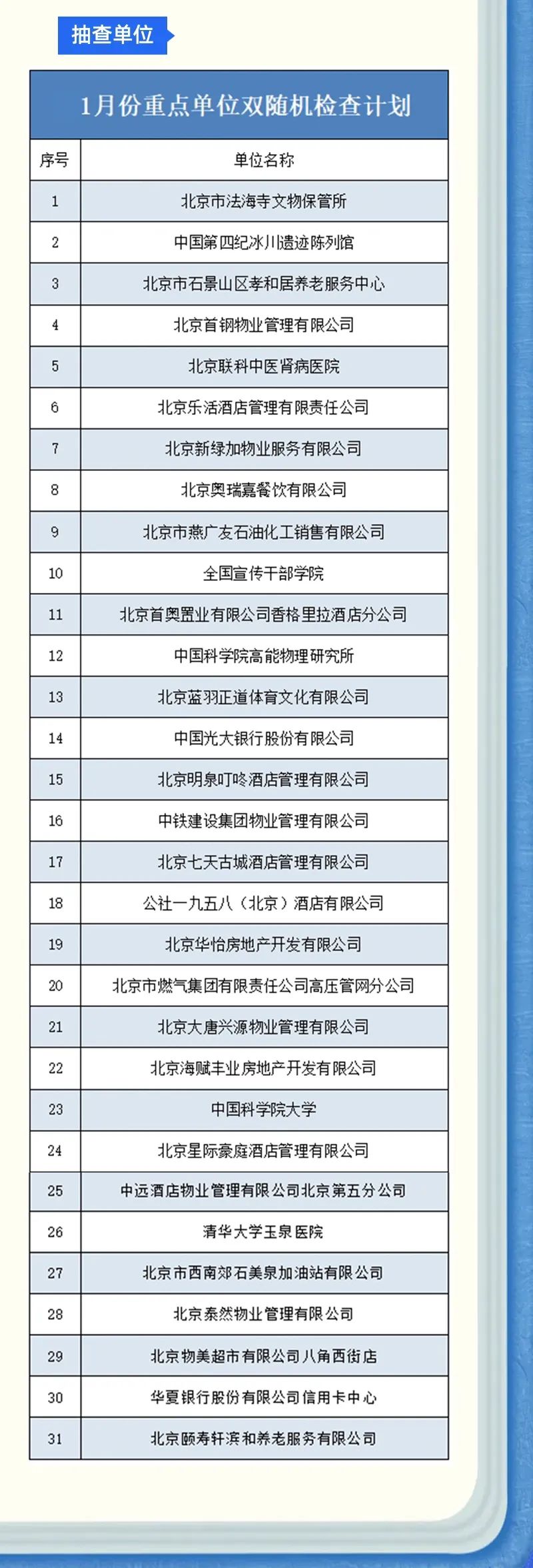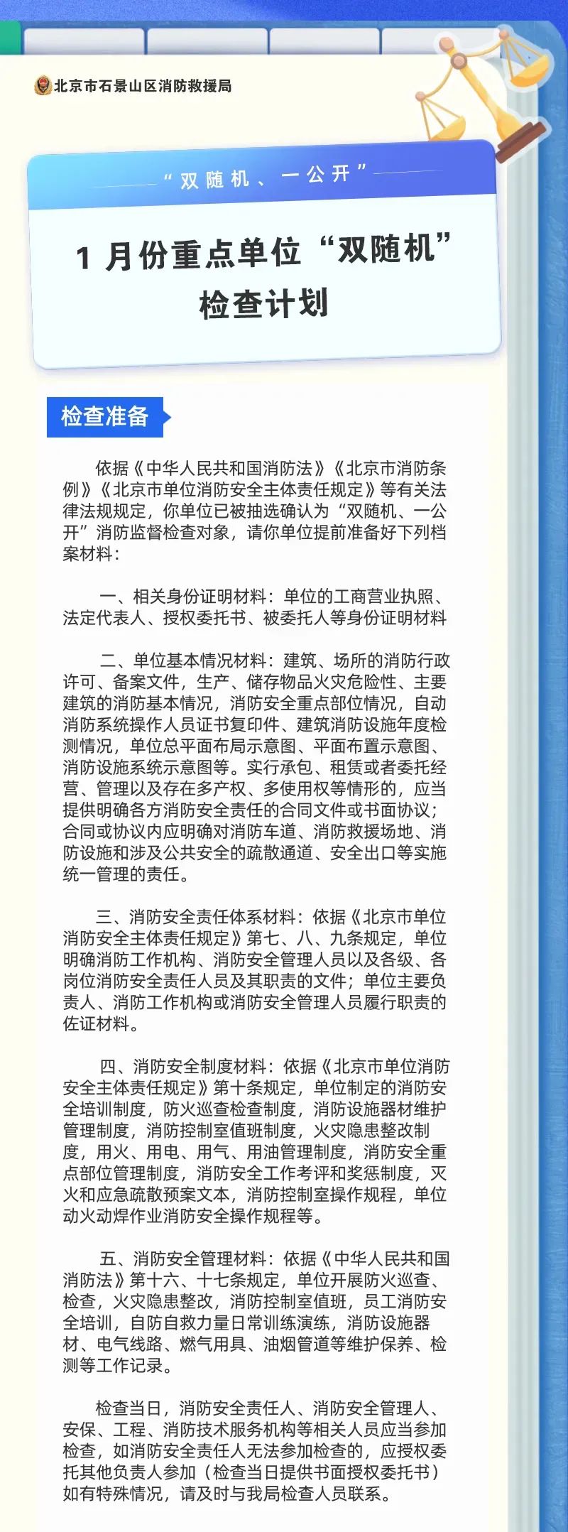 北京市石景山区消防救援局1月份重点单位“双随机”检查计划