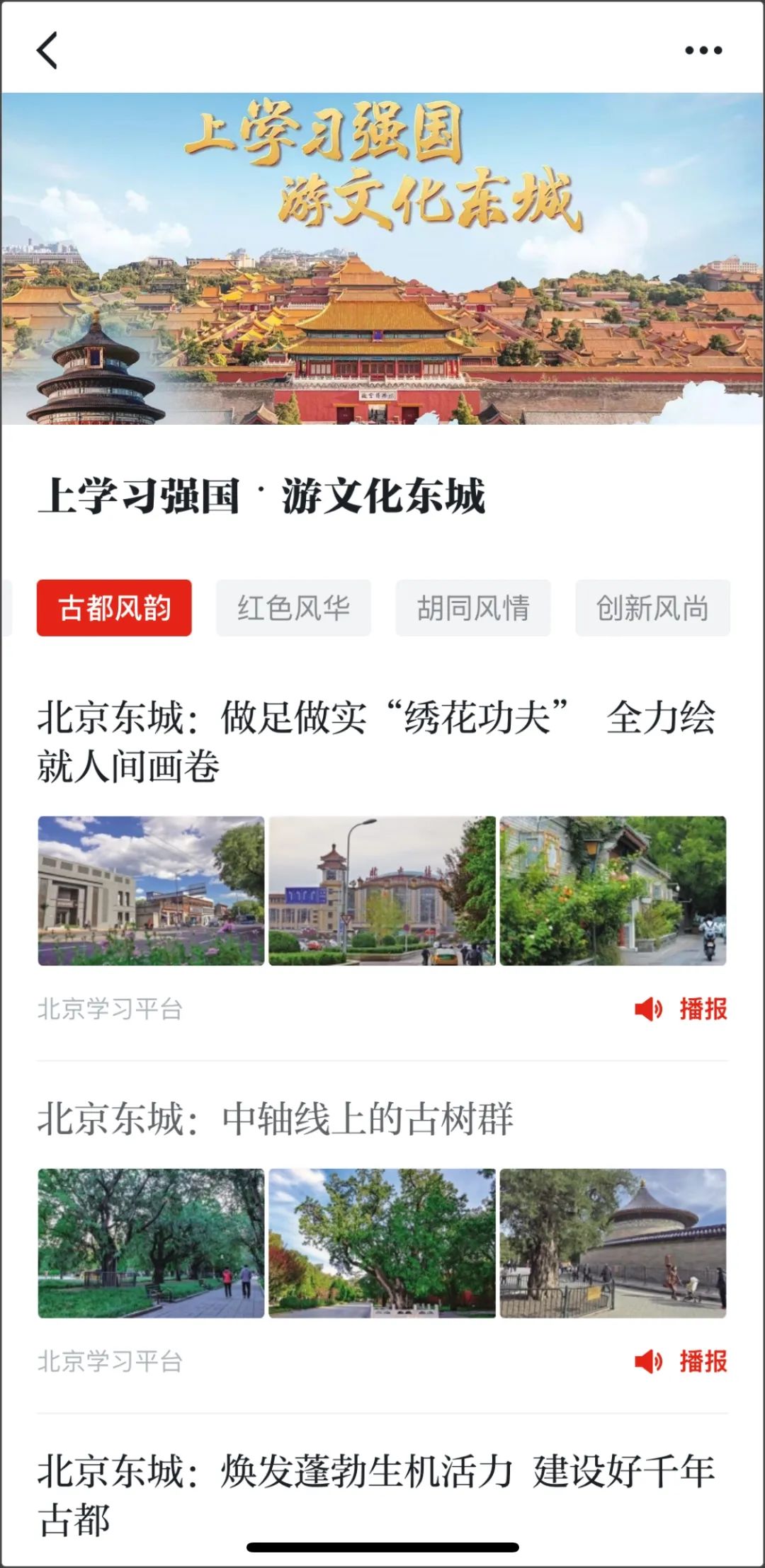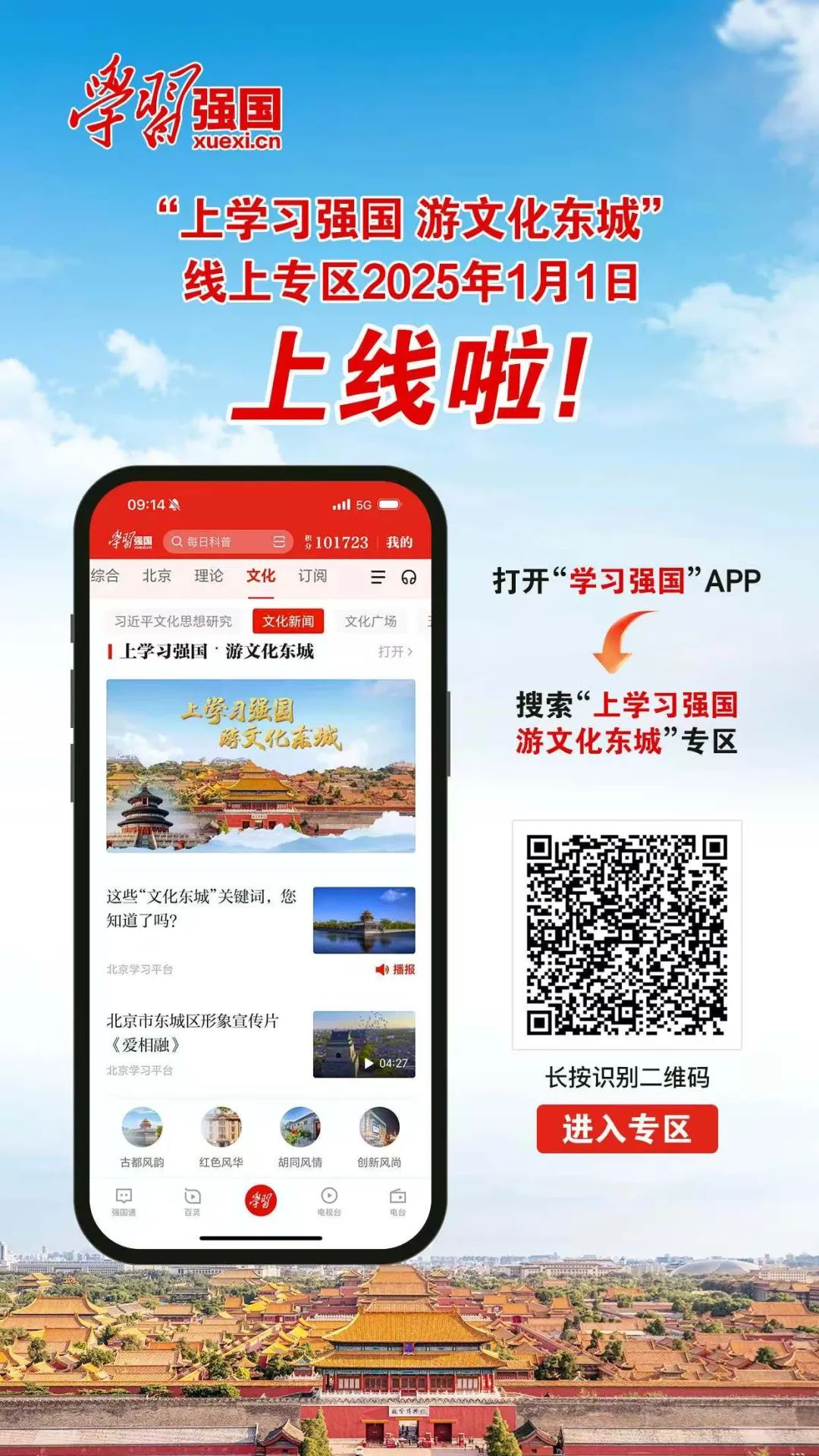 “上学习强国·游文化东城”宣传专区在“学习强国”学习平台推荐频道、文化频道、旅游频道全面上线,诚邀大家在学习中畅游文化东城,于文化里领略强国风采,共赴这场精彩绝伦的文化之旅,感受“文在城中、以文化城、文城一体”的城市意象,见证首善之区在新时代的新征程中谱写更加绚丽的篇章!