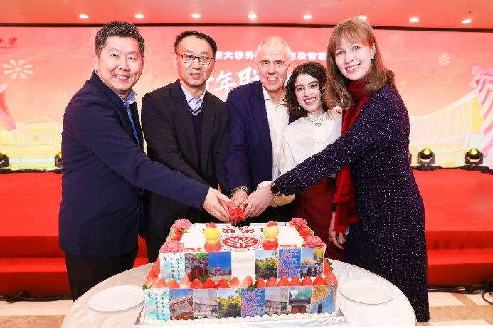 朴世龙、孙涛、历史学系客座讲席教授方德万(HANS VAN DE VEN),2022届俄罗斯籍校友爱丽克斯(POZHIDAEVA, ALEXANDRA)和2024级西班牙籍本科生光洁(GARCIA DIAZ,LUCIA)一同上台切开象征新年甜蜜的蛋糕,共同分享这份喜悦与祝福。