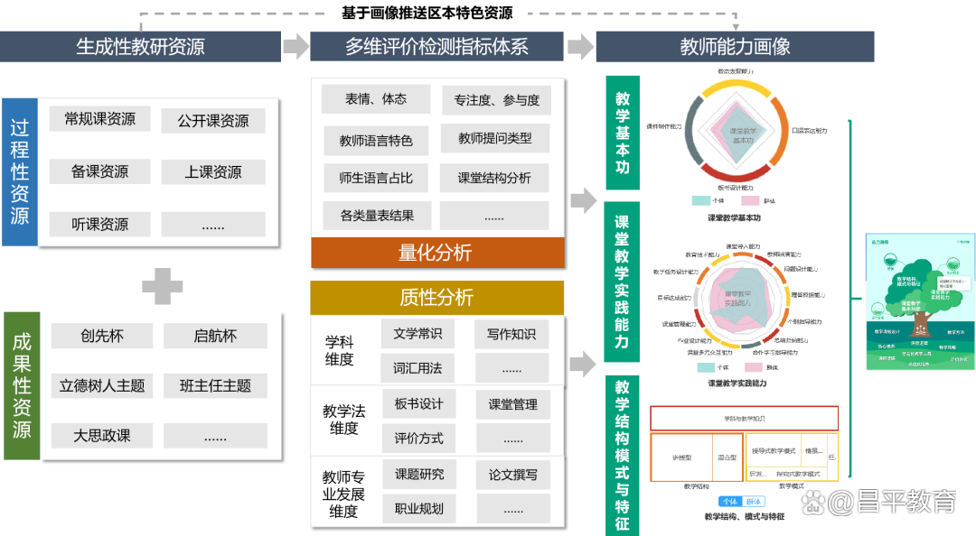 一是智慧教研+AI:区级智慧教研平台汇聚多学科教学过程性资源和优质课程资源,注册教师数7282名,累计上传课例16117节,初步构建形成符合区域特色的教研资源库。借助边缘计算、跨模态学习、语义计算等先进智能技术,选取2000份教学案例进行系统性分析,构建教师数据汇聚分析体系,刻画出教师专业发展及个人能力画像,助力教师专业发展。