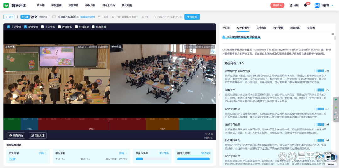 二是双师课堂+AI:经过三年的探索与实践,依托学区和教育集团,形成了“区域-校际-校本”双师课堂研修共同体。通过升级设备的AI能力,采集课堂音视频数据,利用人工智能技术,识别教师教态、行走轨迹、师生互动等行为,分析教师在问题设计、课堂管理、评价反馈等方面的表现,为教师能力提升提供个性化诊断,本年度共授课3026节。