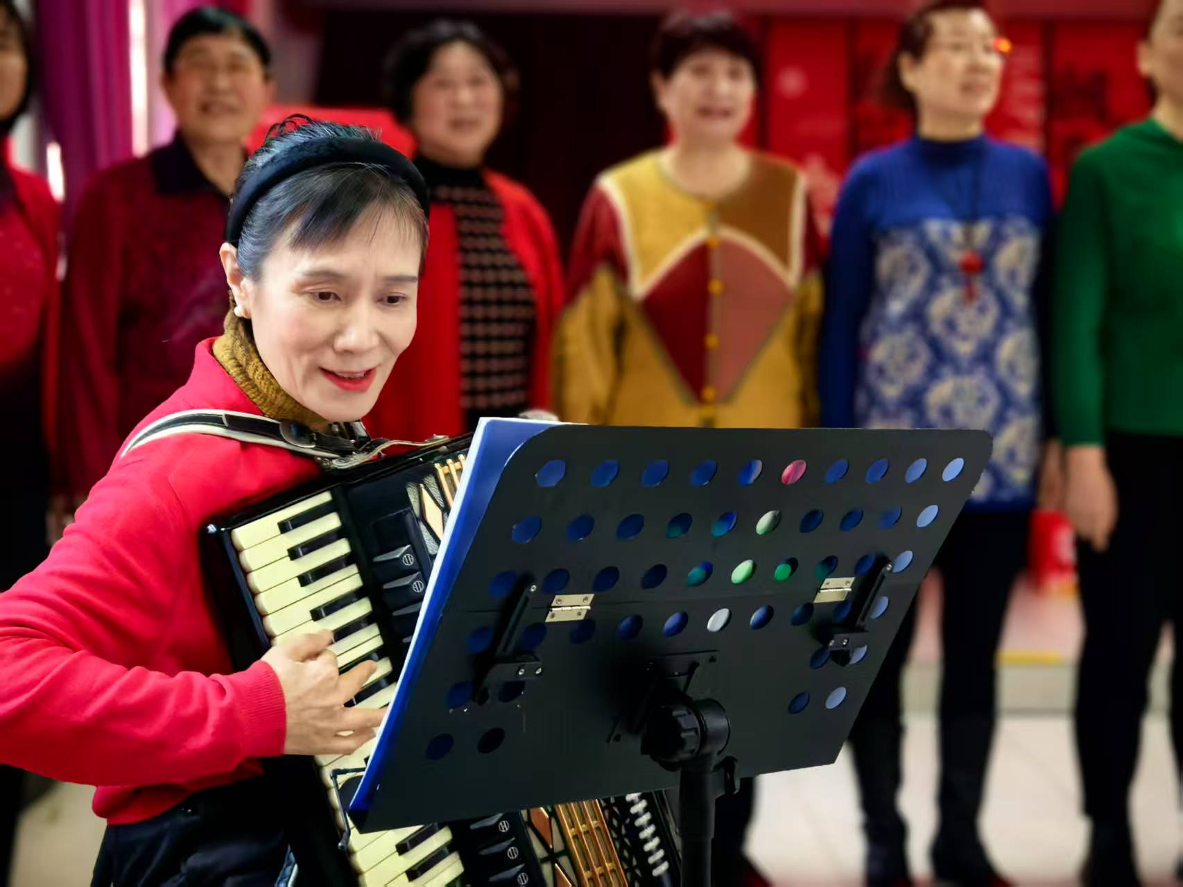 横二社区老党员、37号院第二居民党支部书记吴国安和她的队员们,带来女声合唱《我和我的祖国》《大红枣》,富有感染力的歌声引得全场大合唱。吴国安说:“我们合唱队的10名队员因为共同的爱好走到一起,不仅有业余爱好者,还有专业的手风琴手,我们互相学习共同提高,就是为了在春节联欢会上把最得意的曲目呈现给大家。”除了合唱队,萨克斯队演奏的《春节序曲》与《好运来》,舞蹈队的民族舞《梅花赋》,葫芦丝队演奏的山东民歌《沂蒙山小调》,都展现出了极高的专业水平,赢得观众的阵阵掌声。