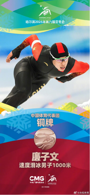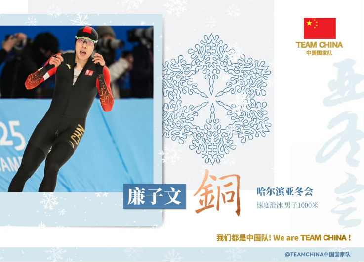 2月11日,在哈尔滨亚冬会速度滑冰男子1000米决赛中,北京运动员廉子文以1分09秒68的成绩获得季军。廉子文在本届亚冬会共斩获1金1铜。