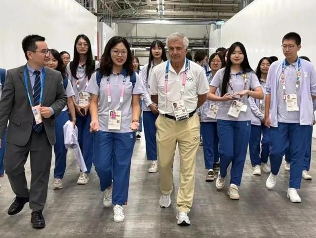 胡安·安东尼奥·萨马兰奇(Juan Antonio Samaranch Jr.)在巴黎奥运会国际广播中心(IBC)与北二外巴黎奥运会实习生交流