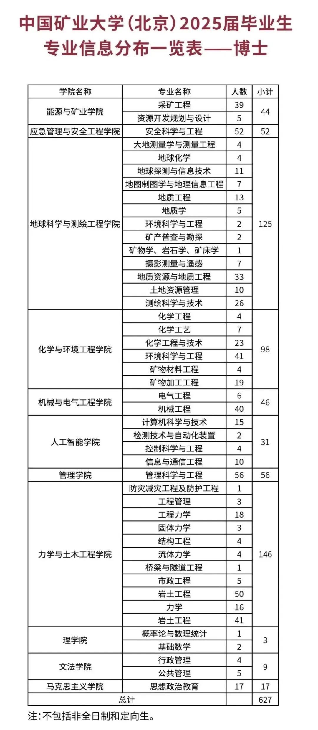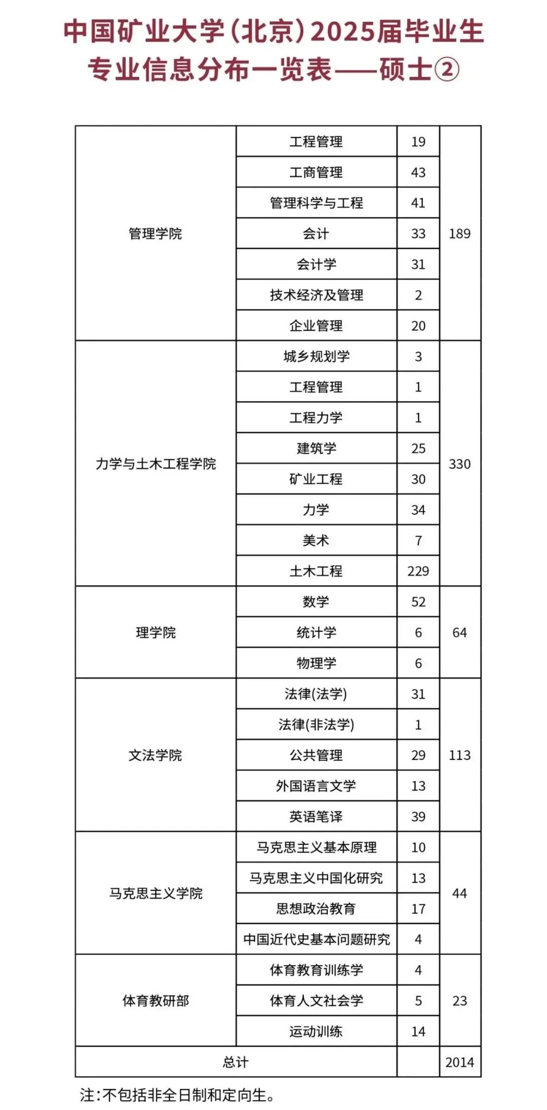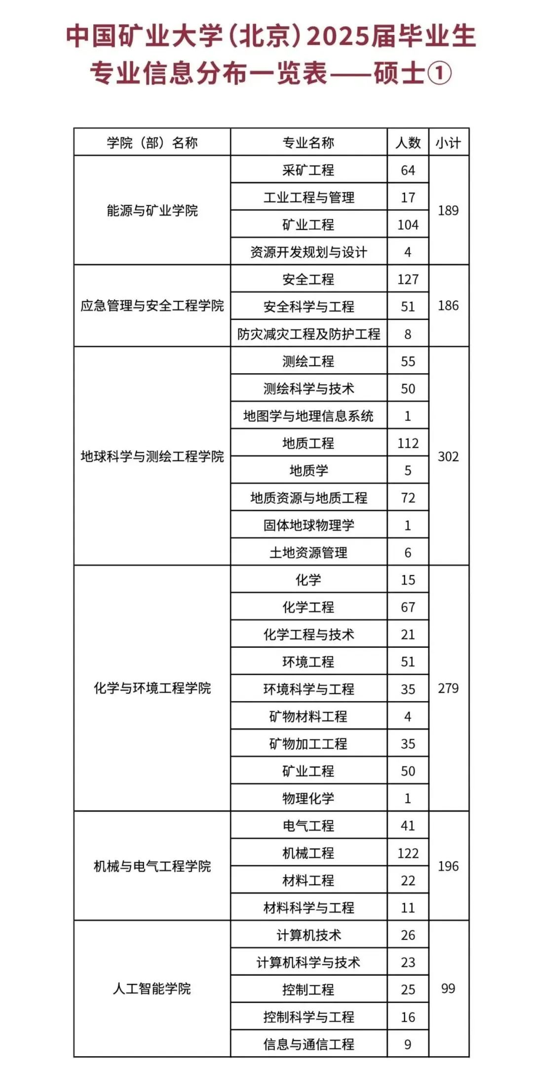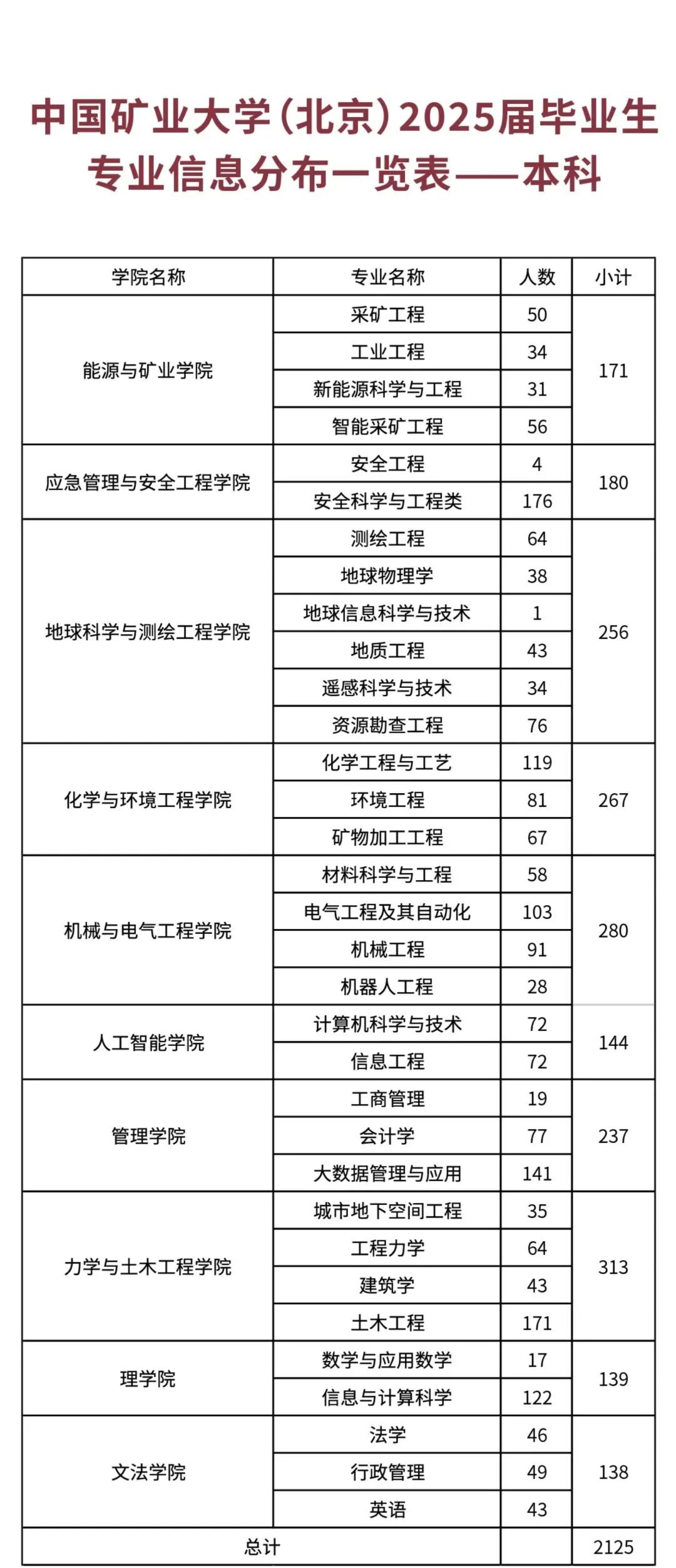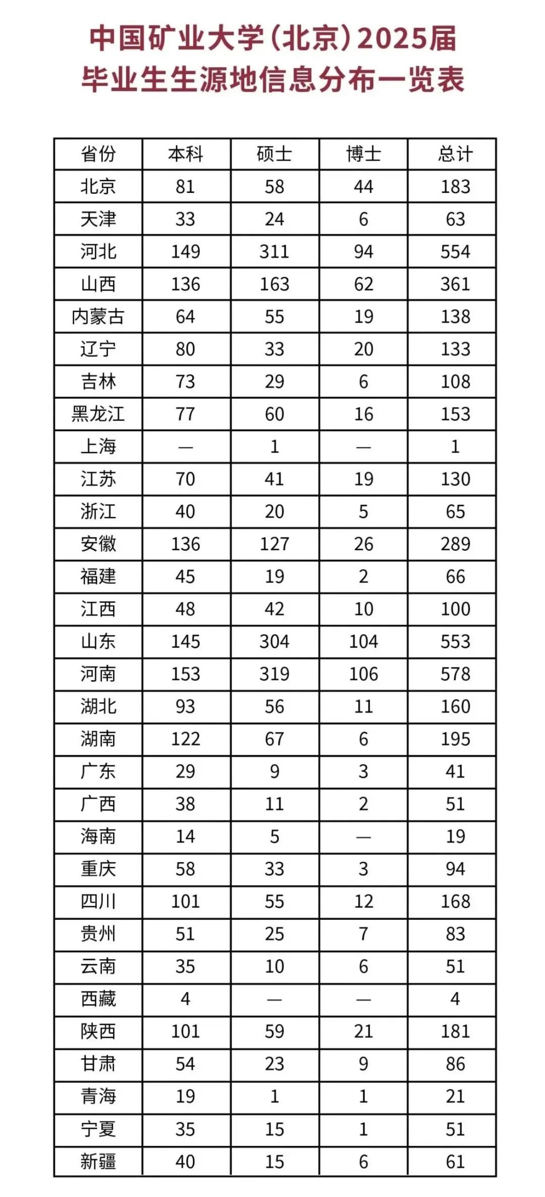 中国矿业大学(北京)2025届预计毕业生总数为4766人(不含非全日制和定向生),其中本科生2125人,硕士研究生2014人,博士研究生627人(以实际毕业生为准)。2025届毕业生信息及专业、生源地分布详见附图。