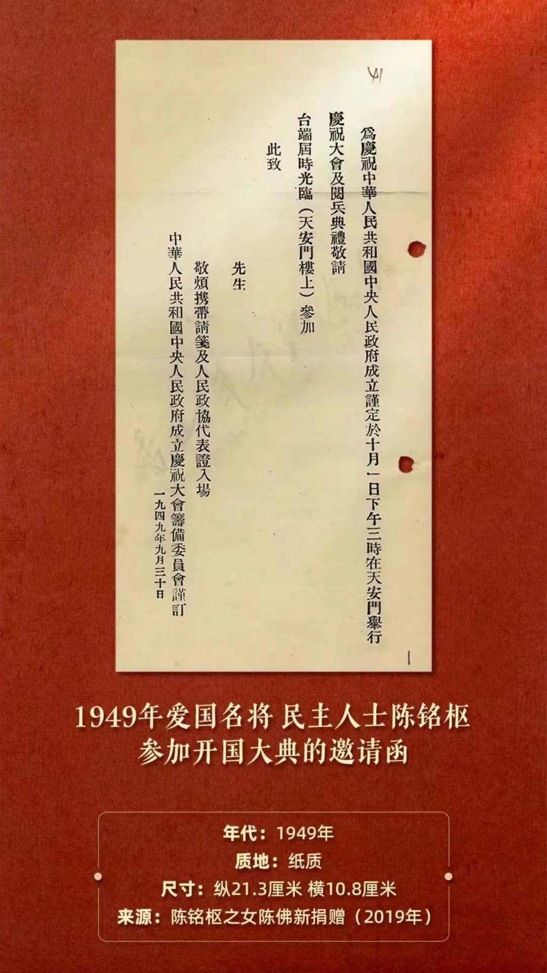 1949年9月20日,中共中央相关部门、华北军区、北平市党政机关召开联席会议,决定成立中华人民共和国中央人民政府成立庆祝大会筹备委员会。9月30日中华人民共和国中央人民政府成立庆祝大会筹备委员会向政协代表发出邀请函。该文物为邀请陈铭枢参加开国大典的邀请函,是开国大典的代表性见证物。