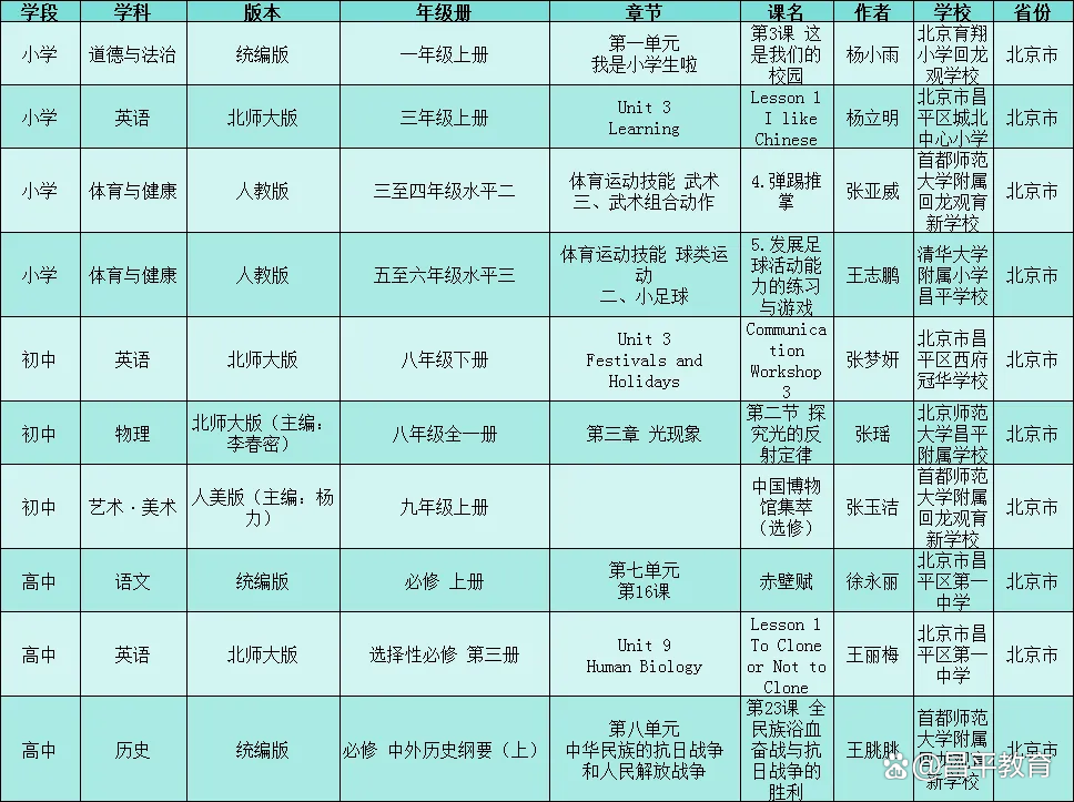 近日,教育部发布2024年“基础教育精品课”遴选“部级精品课”公示名单。部级精品课分为学科课程、实验教学及特殊教育三大类,昌平区中小学共有14节课例入选,一起来看↓↓