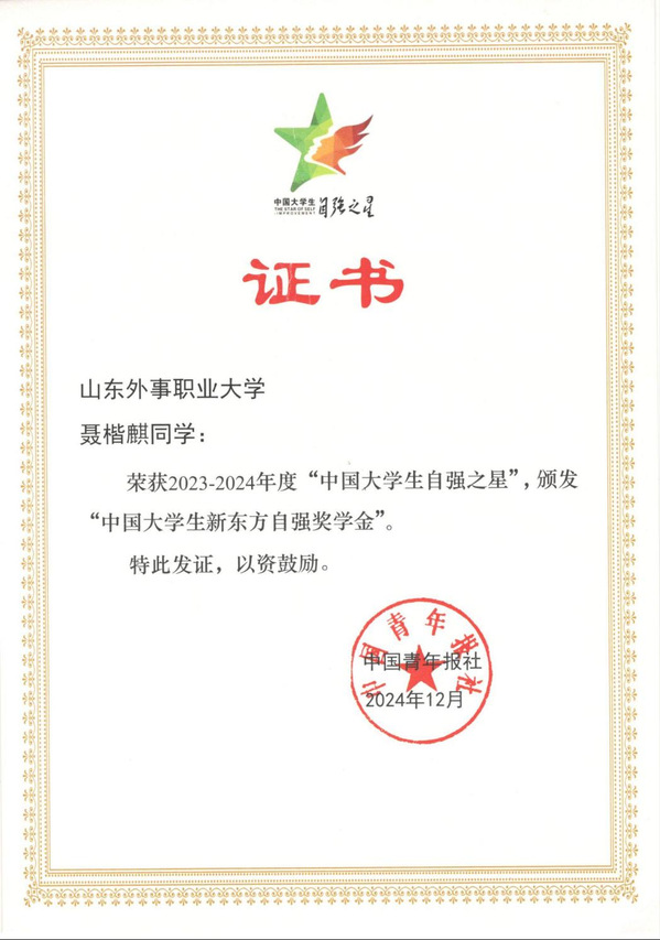 近日,在共青团中央、全国学联指导,团中央基层建设部、中国青年报社等联合举办的2023-2024年度“中国大学生自强之星”奖学金评选中,山东外事职业大学教育学院学前教育2101班聂楷麒同学荣获“中国大学生新东方自强奖学金(社区实践类)”。