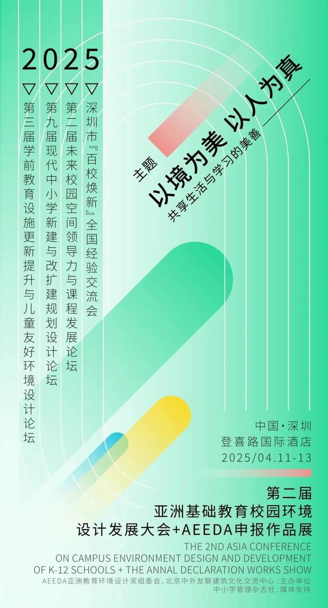 “2025第二届亚洲基础教育校园环境设计发展大会”将于4月11-13日在深圳举办。本次大会将结合深圳「百校焕新」行动、台湾「学美·美学」校园美感设计实践等活动,重点聚焦既有校园环境更新提升课题,探讨未来化空间改造动向、方式和方法。此外,也将对智慧教育、空间与课程、儿童友好环境设计等议题进行专门研讨和交流。