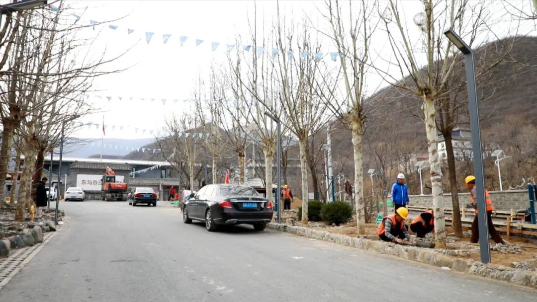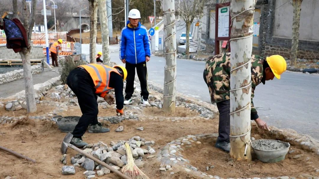 在王平镇东马各庄村,数名工人正蹲在入口三角地处,紧锣密鼓地进行施工作业。