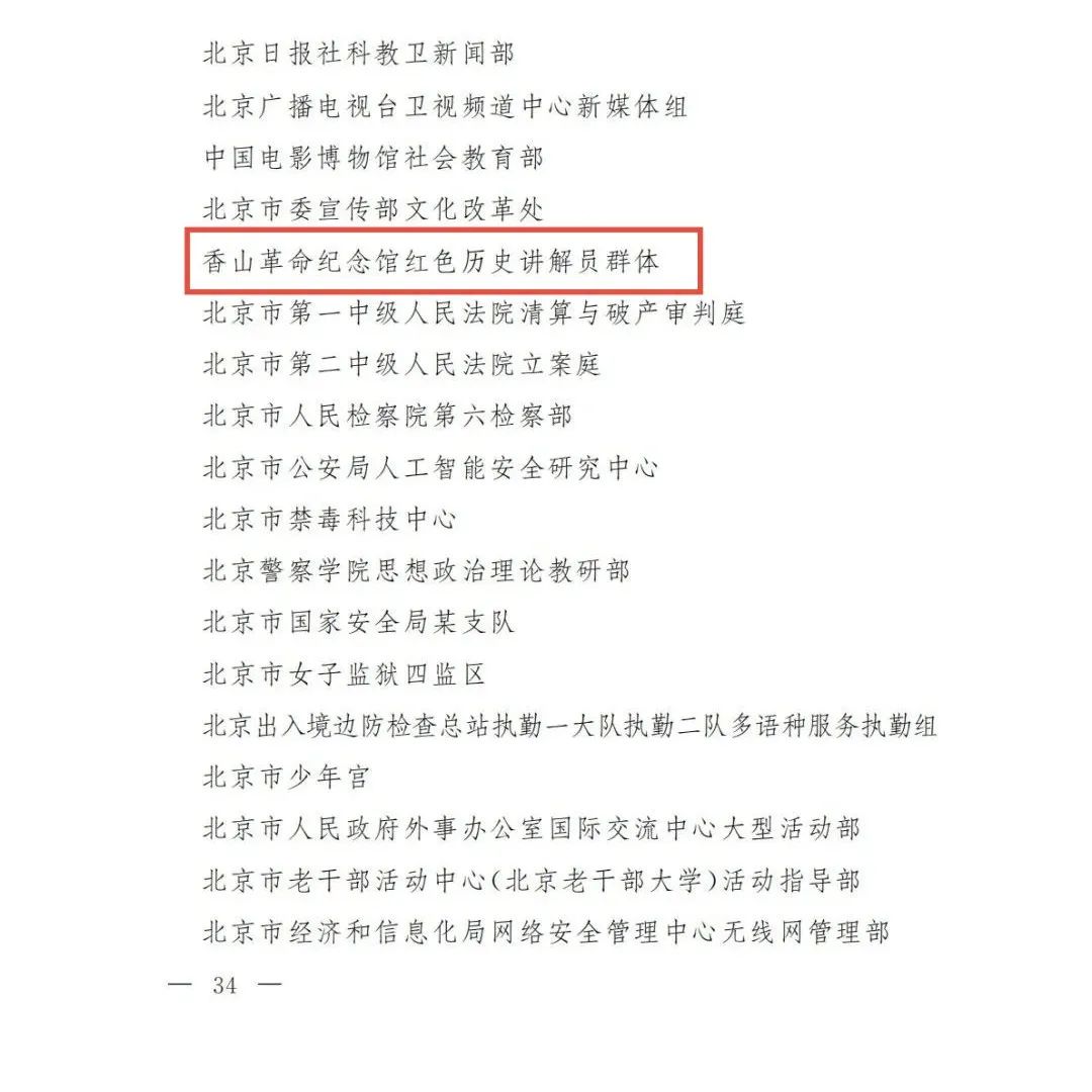 日前,北京市妇女联合会、北京市总工会、北京市人力资源和社会保障局发布“北京市三八红旗奖章、北京市三八红旗集体”名单,香山革命纪念馆红色历史讲解员群体荣获“北京市三八红旗集体”荣誉称号。