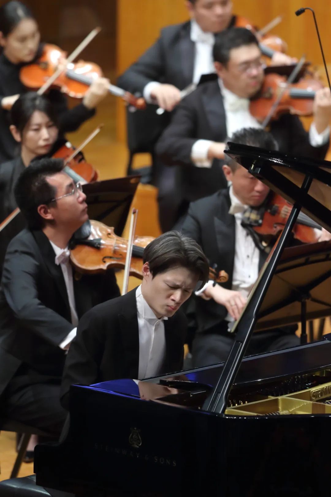 作品的音符虽然简单,但像念诵经文一般的长时间重复,以及乐谱上经常跳出的反复记号,容易令人分神、迷失。而在吕嘉的谨慎调度与缜密配合下,制造了很多凝神屏息的弱奏瞬间,吕嘉的指挥在此展现了出色的克制与平衡。他并未过度渲染格拉斯的动态对比,而是以精准的节拍控制,让乐团与钢琴形成镜像般的对话。弦乐声部以绵密的震音铺陈出迷离的背景,与钢琴冷冽的旋律线交织成一道抽象的音画。这种处理方式,既呼应了格拉斯“去情感化”的创作理念,又通过音色层次的微妙调配,避免了极简主义可能带来的单调感。在快速音群中,鞠小夫指尖如精密仪器般游走,既保持了极简主义机械律动的骨架,又通过微妙的力度起伏注入了一丝东方的诗意。格拉斯与东方乃至中国的关系不可谓不密切,他的创作受到印度音乐的极大影响,不但为吴蛮创作了多部作品,还广泛关注北京奥运会以及中国发生的方方面面的变化。