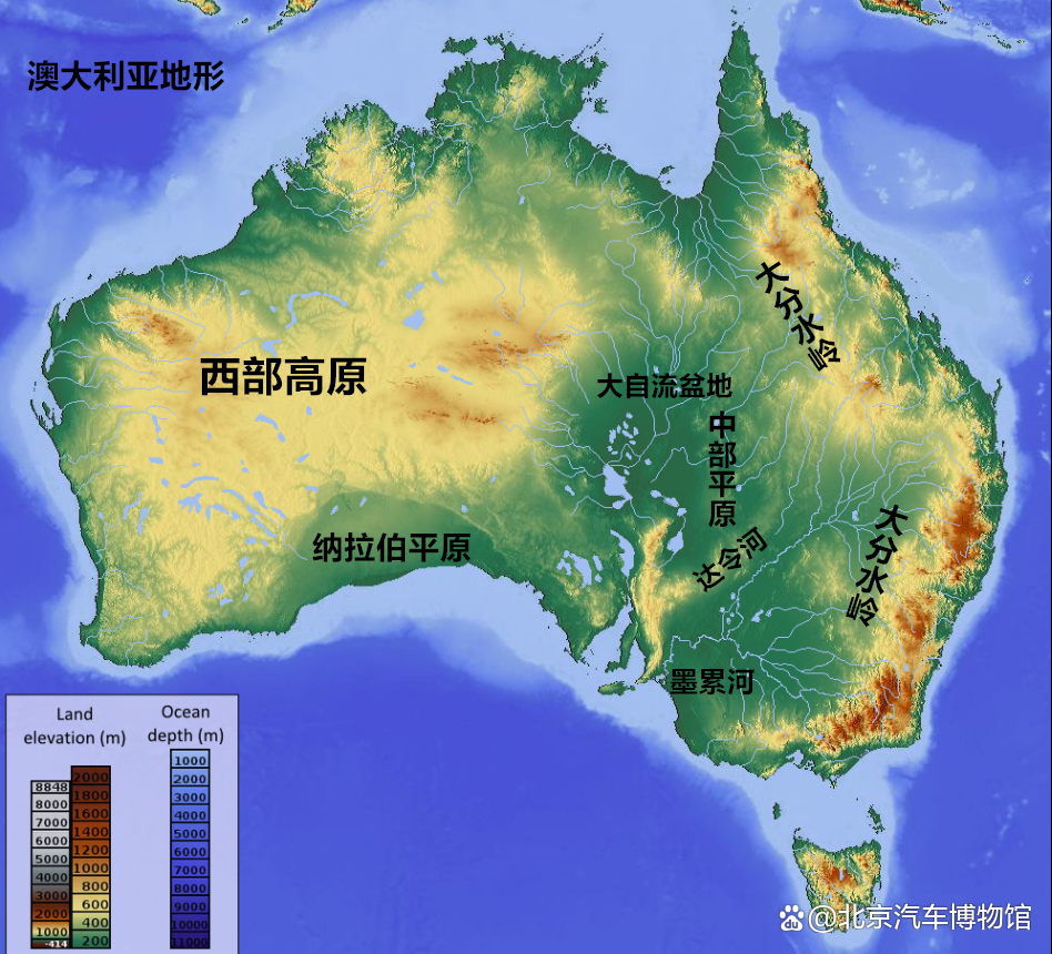 澳大利亚大陆的地形可以分为东部、中部和西部三个不同的地形分布区,整体海拔高度不大,平均海拔仅为350米左右,最高峰是位于东南部的科修斯科山,海拔2230米。西部是海拔200—500米的低高原,多分布沙漠和半沙漠;中部是平原,海拔在200米以下,盛长草本植物,是广大的草原;东部是古老山脉所形成的高地,大部分的城市都分布在东部和南部沿海地带。