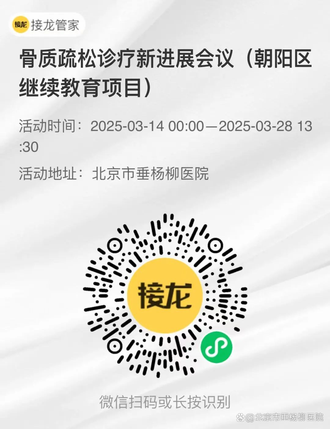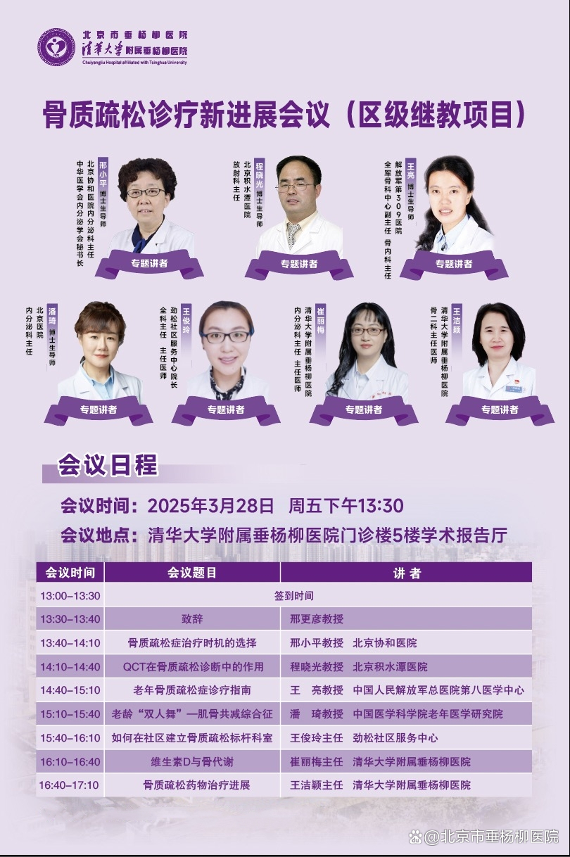 随着人口老龄化,骨质疏松及其引发的骨折问题已成为全球公共健康的焦点。为了探索骨质疏松疾病的新治疗途径,清华大学附属垂杨柳医院运动医学与关节外科将举办“骨质疏松诊疗新进展会议”。本次会议将邀请北京各大医院的骨质疏松领域专家,共同探讨骨质疏松的治疗方案、影像学评估及前沿进展,助力实现“绿色微创精准”的医疗新模式。