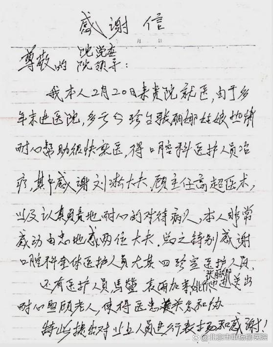 在丛老先生的感谢信中,字里行间流露出对医护人员的由衷感激:“感谢口腔科全体医护人员”老人这样写道,“特别要感谢楚主任和刘医生的高超医术以及认真责地耐心地对待病人,本人非常感动由衷地感谢两位大夫。”