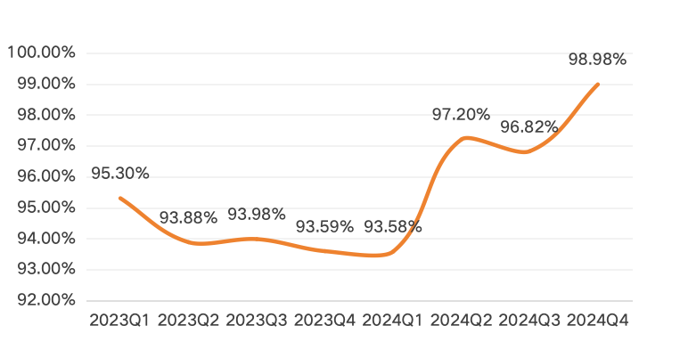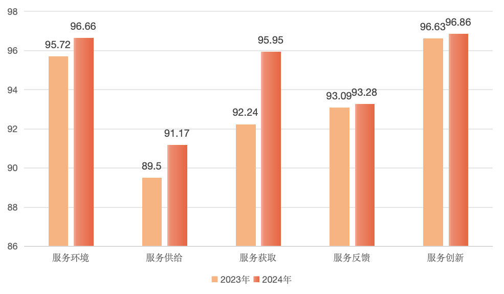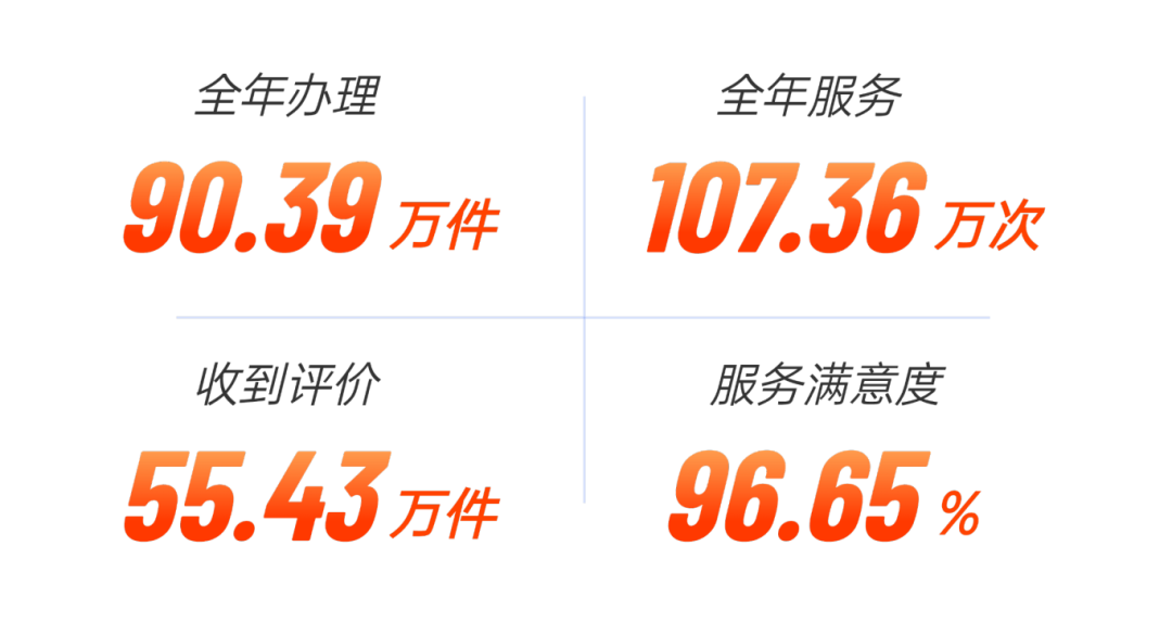 2024年度政务服务整体满意度96.65%,较2023年度环比提升2.46%。企业群众用一票票“非常满意”为优质高效的“红墙政务”点赞。