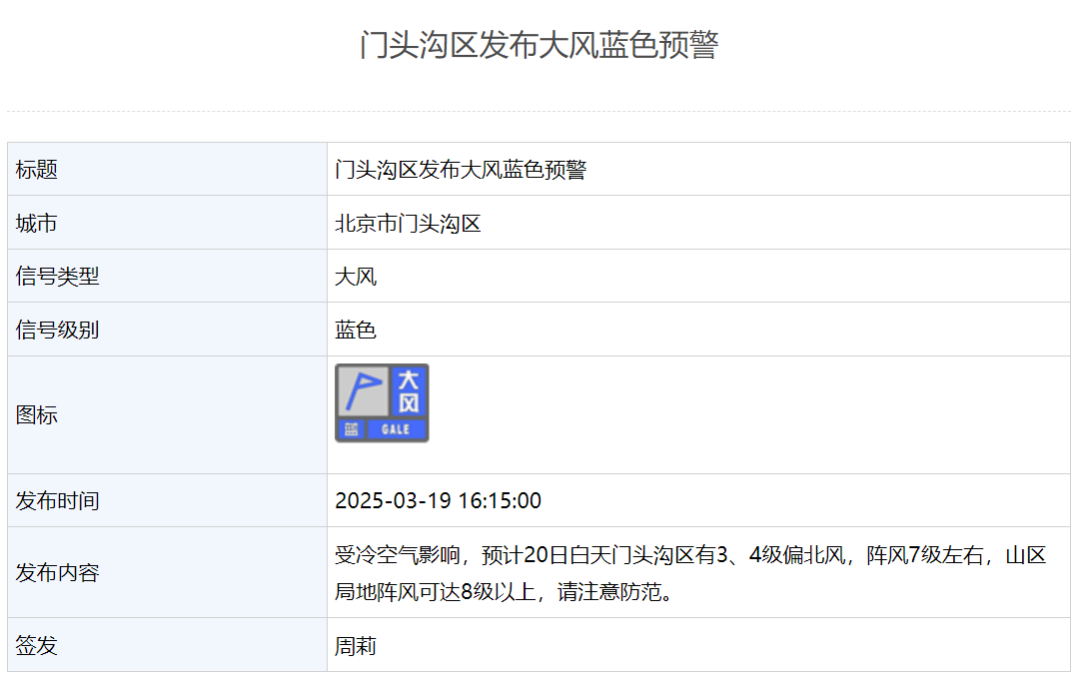 门头沟区气象台3月19日16时15分发布大风蓝色预警:受冷空气影响,预计20日白天门头沟区有3、4级偏北风,阵风7级左右,山区局地阵风可达8级以上,请注意防范。