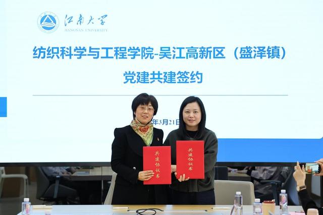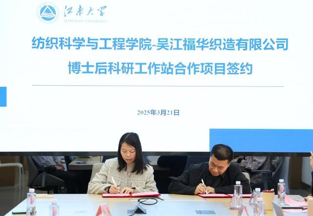 会上举行了合作签约仪式。张菁燕和周蕾分别代表双方党委签署了党建共建协议,吕婧和吴江福华织造有限公司总经理张长建分别代表校企签署了博士后科研工作站合作项目协议。