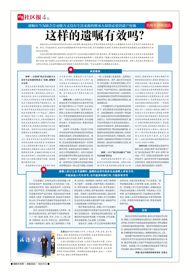 孔德义律师通过解析典型案例,结合《中华人民共和国民法典》第1141条的规定,即“遗嘱应当为缺乏劳动能力又没有生活来源的继承人保留必要的遗产份额”,《最高人民法院关于适用继承编的解释(一)》第25条,“遗嘱人未保留缺乏劳动能力又没有生活来源的继承人的遗产份额,遗产处理时,应当为该继承人留下必要的遗产,所剩余的部分,才可参照遗嘱确定的分配原则处理。继承人是否缺乏劳动能力又没有生活来源,应当按照遗嘱生效时该继承人的具体情况确定。”为公众提供订立遗嘱的专业指引。