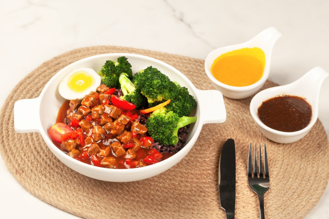 番茄牛肉+杂粮饭+蔬菜+碳水(4选1)+例汤