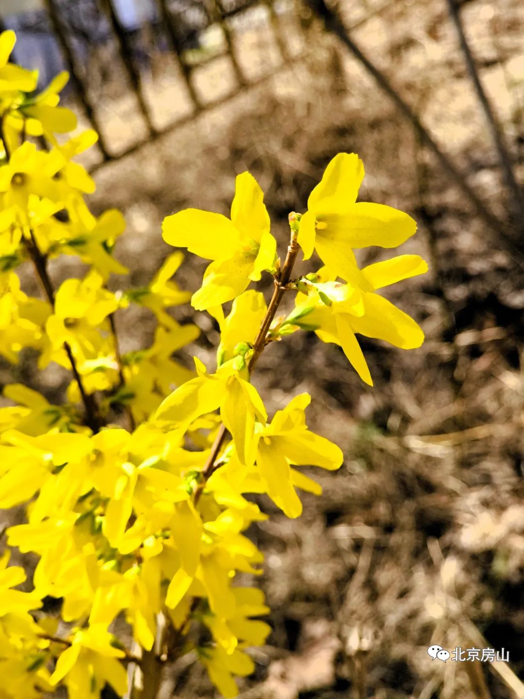 尽管春寒未消,连翘花却已争先绽放,金黄的花朵缀满枝头,为生态园增添了一抹明亮的色彩。
