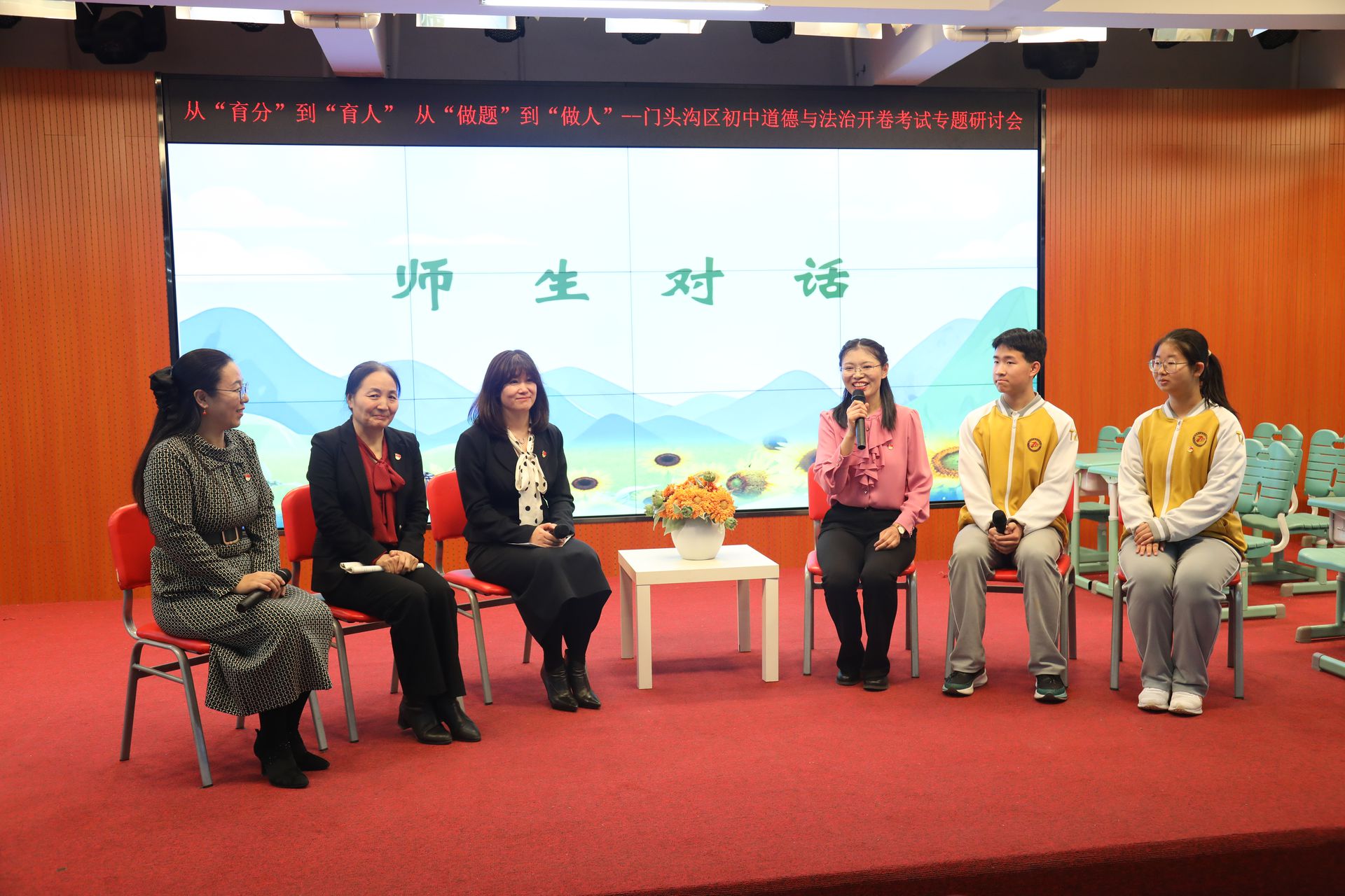 在师生对话环节,与会专家、研修员与师生共同探讨了在开卷考试的背景下,师生应该如何学好道德与法治这门学科。“真正的知识不仅要从书本中获取,更要从生活中获得。学校开展的社会实践活动能够帮助我理解和消化学科知识,提升思维的活跃性。”学生李玮健说。对于学生宋天亮来说,课堂的改变带给他的是在考试中能够更加积极从容地应对和作答:“以前我总认为开卷考试就是抄书,但我通过将参与的实践调研和试卷答题相关联时,我才深刻理解了‘纸上得来终觉浅,绝知此事要躬行’的真正含义。”