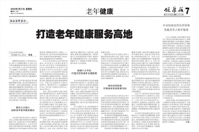 近年来,北京老年医院在老年健康服务模式创新、老年医学服务适宜技术推广、老年友善医院建设、老年健康标准规范编制等方面持续发力,持续完善老年健康服务体系,成功立项并组织实施国家公立医院改革与高质量发展示范项目“数智化整合型全链式老年健康与医养结合服务模式创新示范工程”,在老年健康与医养结合服务方面积累了宝贵经验。