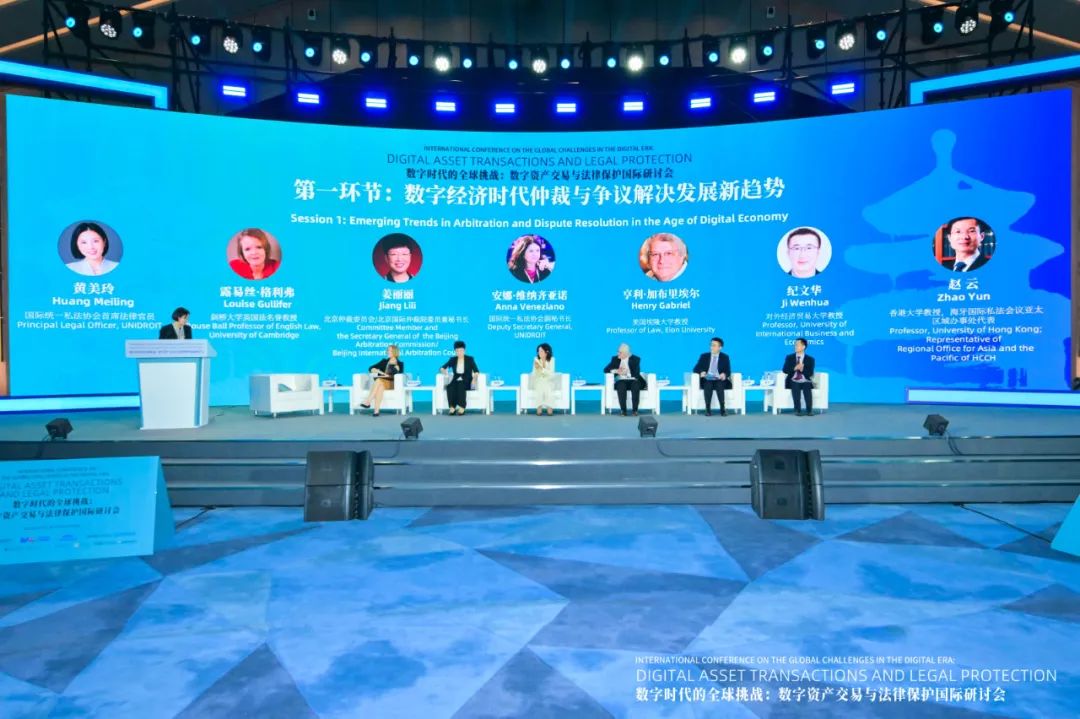 “数字经济时代仲裁与争议解决发展新趋势”由国际统一私法协会首席法律官员黄美玲主持,剑桥大学英国法名誉教授露易丝·格利弗,北仲委员兼秘书长姜丽丽,国际统一私法协会副秘书长安娜·维纳齐亚诺,美国埃隆大学教授亨利·加布里埃尔,对外经济贸易大学教授纪文华,香港大学教授、海牙国际私法会议亚太区域办事处代表赵云围绕在线争议数字经济纠纷解决在中国的发展趋势、国际统一私法协会视角下数字资产执行以及在线争议的国际法律文书等实践问题进行了讨论。