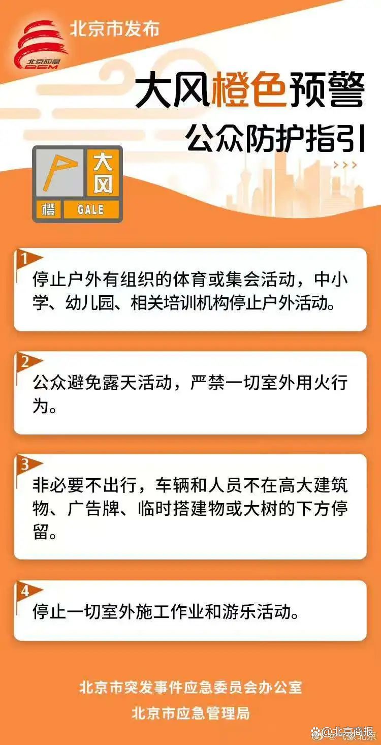 在北京发布大风橙色预警后,北京市应急办发布公众防护指引:停止户外有组织的体育或集会活动,中小学、幼儿园、相关培训机构停止户外活动;停止一切室外施工作业和游乐活动。请广大市民尽量减少或停止户外活动,外出时远离树木、广告牌、临时搭建物,谨防高空坠物。居家注意用电安全,做好火灾防范。
