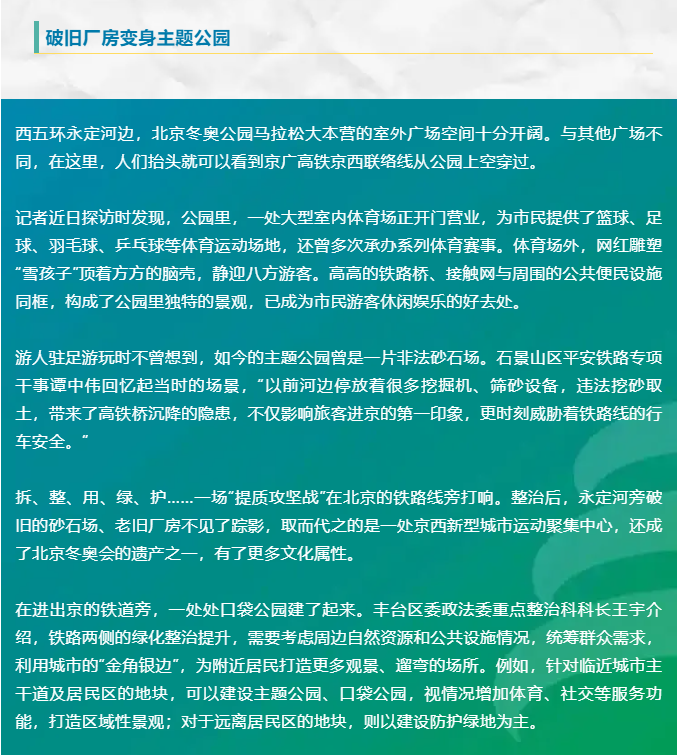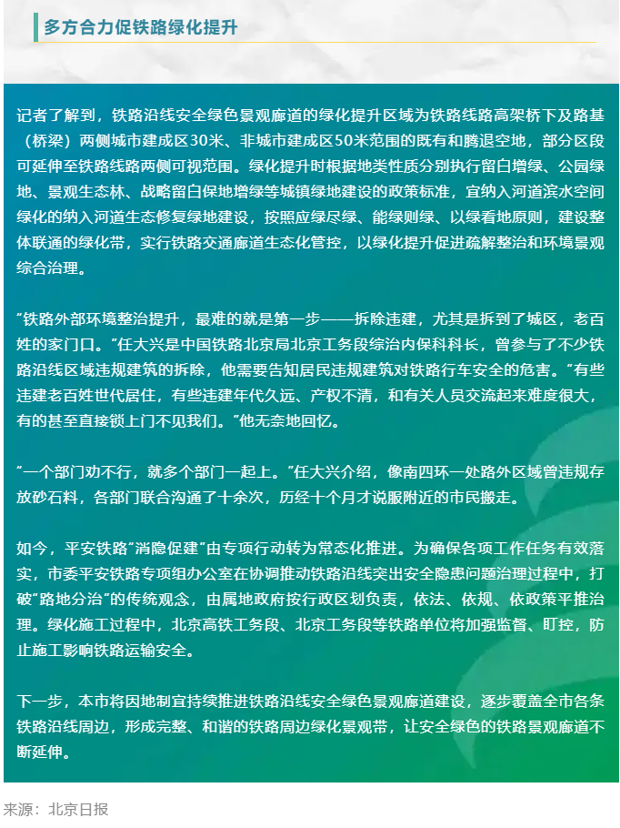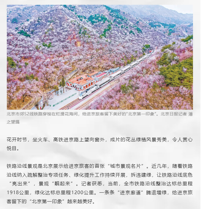 全市铁路沿线整治达标总里程1918公里,绿化达标总里程1200公里进京绿廊扮靓“北京第一印象”
