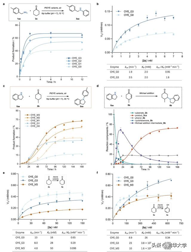 为了深入了解这一酶促反应的机理,研究人员对生物催化脱氢偶联反应进行了一系列动力学研究。首先,研究人员使用二级苯胺合成酶进化谱系中的各个变体针对3aa的酶催化合成进行了时间进程实验,并通过Michaelis-Menten曲线分析酶的动力学参数。实验结果表明定向进化引入的突变有效地提高了苯胺合成酶OYE_G3的kcat。随后,研究人员用类似的方法对三级苯胺3ca的合成反应进行了时间进程研究。与二级苯胺合成体系不同的是,三级苯胺合成反应的前期会发生可逆的aza-Michael加成过程形成中间体6b,因此反应会显示出明显的诱导期(induction period)。为了明确探究酶活性是否从环己酮脱氢转移到亚胺脱氢,研究人员比较了最初变体(OYE_G0)与定向进化谱系的两个最终变体(OYE_G3和OYE_M3)生成苯酚的活性变化(图4e和4f)。实验结果表明,进化后的变体对于苯酚生成过程的催化能力显著下降。