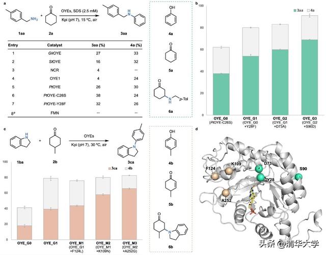 研究初期,研究人员首先对野生型黄素酶及其突变体的亚胺脱氢芳构化活性进行了系统性筛选。实验数据显示,课题组现有酶库中的OYE_G0突变体对于目标反应具有显著的初始活性,能够以最高的转化率(38%)催化生成目标产物3aa且目标产物与副产物4a的比例最优,体现了这类脱氢酶具有被进一步优化的潜力。