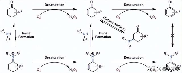 4月7日,清华大学生物医学交叉研究院刘臻课题组在《德国应用化学》(Angewandte Chemie International Edition)发表了题为“氧化胺化合成苯胺的酶促平台”(An Enzymatic Platform for Aniline Synthesis through Oxidative Amination)的研究论文。通过改造该实验室开发的黄素(FMN)依赖酶PtOYE(源自Parageobacillus thermantarcticus),这一催化体系可以有效地将胺类化合物和环己酮衍生物组合,通过氧化胺化的机制制备多种二级和三级苯胺。针对结构不同的胺类底物,研究人员分别通过两条定向进化路径获得了各自的优势突变体OYE_G3和OYE_M3,提高了酶催化的效率并抑制了环己酮直接脱氢生成苯酚的副反应。通过多组动力学实验,研究人员系统研究了这类苯胺合成酶的催化机制。实验表明,优势突变体不仅提高了亚胺中间体芳构化的催化效率,且降低了环己酮直接脱氢生成苯酚的活性,形成了有利于目标反应的协同效应。