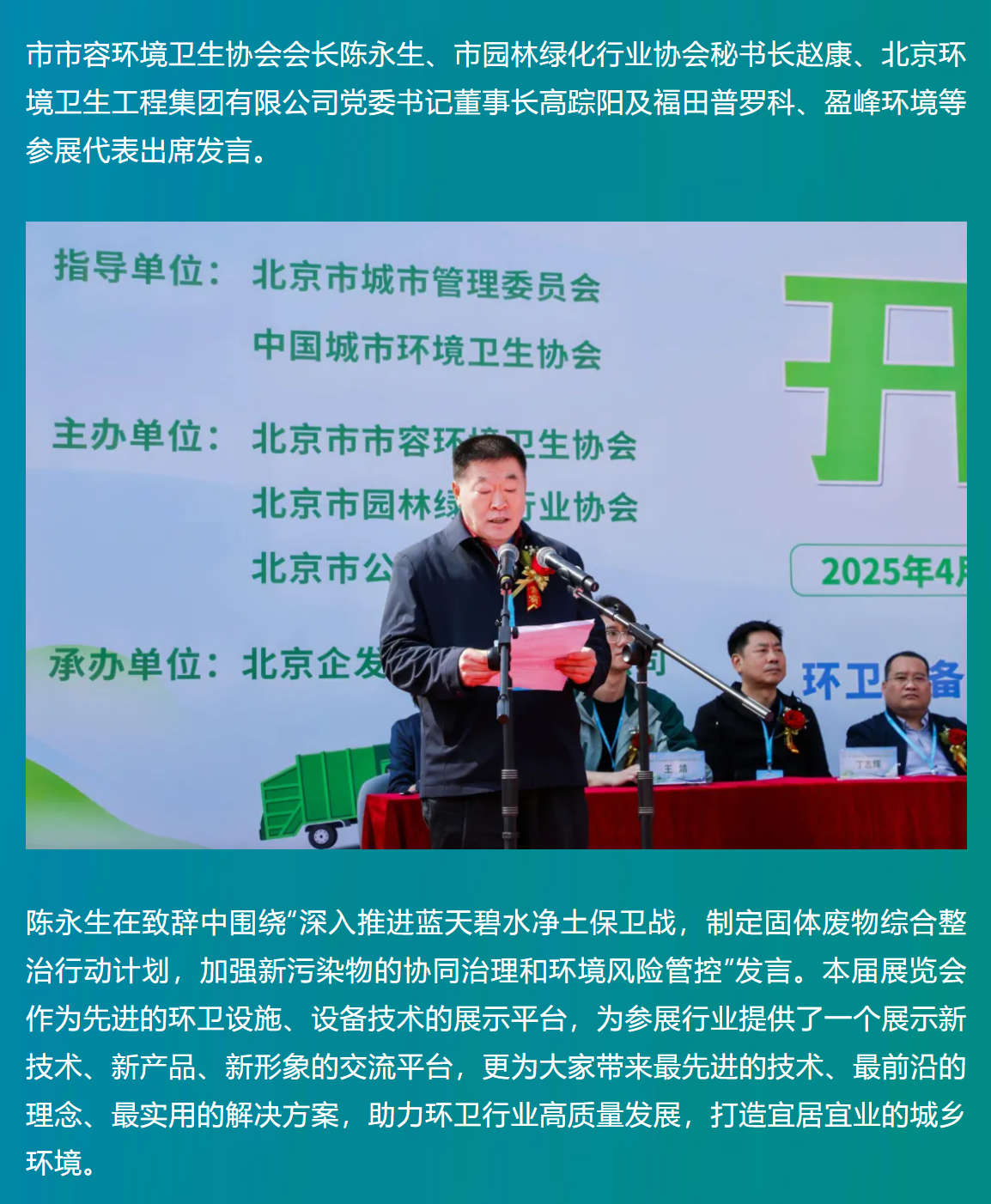 4月10日,在市城市管理委、中国城市环境卫生协会指导下,北京市市容环境卫生协会主办的第25届北京国际环卫与市政设施及清洗设备展览会在全国农业展览馆隆重举办。在为期三天的会议中,政府、企业、专家学者们共话环卫行业新技术、新产品及设备,探讨环卫改革、回收利用、有机固废及道路作业等主题,携手共筑清洁、宜居的城市环境。
