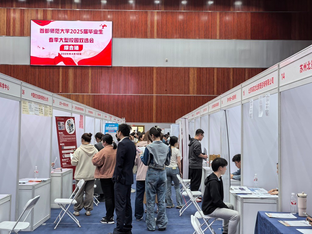 为进一步推进“春季促就业攻坚行动”,持续扩大岗位供给,根据教育部、北京市和学校关于做好毕业生就业工作部署,4月10日下午,首都师范大学在北一区体育馆举办2025届毕业生春季大型校园双选会。国家博物馆、中国社会科学出版社、北京市陈经纶中学、中国航空结算有限责任公司、国家纳米科学中心、四川省巴中市人才引进工作组等111家知名中小学、企事业用人单位应邀参会,提供有效需求岗位近2000个。为满足学生个性化需求,双选会还为西城区人力资源和社会保障局、美术学院招募的用人单位设置了单独展区。